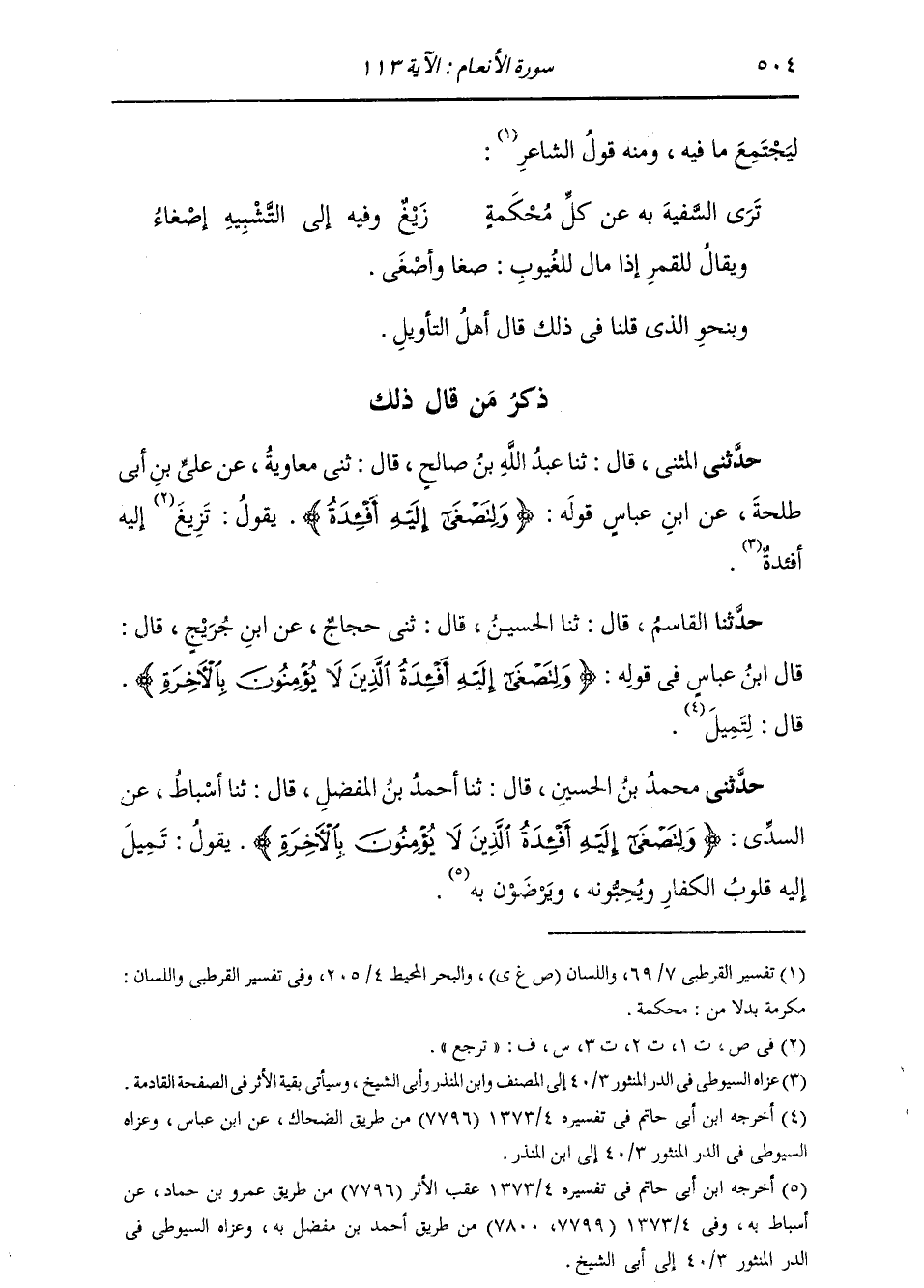 ذِكْرُ مَنْ قَالَ ذَلِكَ حَدَّثَنِي الْمُثَنَّى، قَالَ: ثنا عَبْدُ اللَّهِ بْنُ صَالِحٍ، قَالَ: ثني مُعَاوِيَةُ، عَنْ عَلِيِّ بْنِ أَبِي طَلْحَةَ، عَنِ ابْنِ عَبَّاسٍ: {§وَلِتَصْغَى إِلَيْهِ أَفْئِدَةُ} [الأنعام: 113] يَقُولُ: «تَزِيغُ إِلَيْهِ أَفْئِدَةٌ»