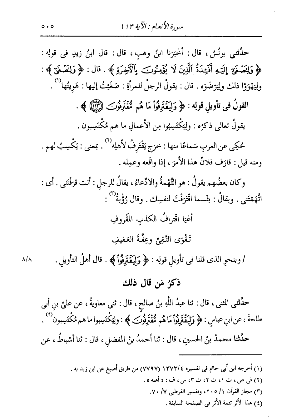 ذِكْرُ مَنْ قَالَ ذَلِكَ حَدَّثَنِي الْمُثَنَّى، قَالَ: ثنا عَبْدُ اللَّهِ بْنُ صَالِحٍ، قَالَ: ثني مُعَاوِيَةُ، عَنْ عَلِيِّ بْنِ أَبِي طَلْحَةَ، عَنِ ابْنِ عَبَّاسٍ: {§وَلِيَقْتَرِفُوا مَا هُمْ مُقْتَرِفُونَ} [الأنعام: 113] : «وَلِيَكْتَسِبُوا مَا هُمْ مُكْتَسِبُونَ»