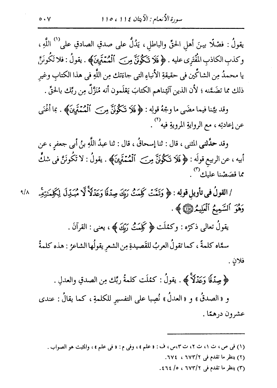 §الْقَوْلُ فِي تَأْوِيلِ قَوْلِهِ تَعَالَى: {وَتَمَّتْ كَلِمَةُ رَبِّكَ صِدْقًا وَعَدْلًا لَا مُبَدِّلَ لِكَلِمَاتِهِ وَهُوَ السَّمِيعُ الْعَلِيمُ} يَقُولُ تَعَالَى ذِكْرُهُ: وَكَمَلَتْ كَلِمَةُ رَبِّكَ، يَعْنِي الْقُرْآنَ. سَمَّاهُ كَلِمَةً كَمَا تَقُولُ الْعَرَبُ لِلْقَصِيدَةِ مِنَ الشِّعْرِ يَقُولُهَا الشَّاعِرُ: هَذِهِ كَلِمَةُ فُلَانٍ. {صِدْقًا وَعَدْلًا} [الأنعام: 115] يَقُولُ: كَمَلَتْ كَلِمَةُ رَبِّكَ مِنَ الصِّدْقِ وَالْعَدْلِ، وَالصِّدْقُ وَالْعَدْلُ نَصْبًا عَلَى التَّفْسِيرِ لِلْكَلِمَةِ، كَمَا يُقَالُ: عِنْدِي عِشْرُونَ دِرْهَمًا