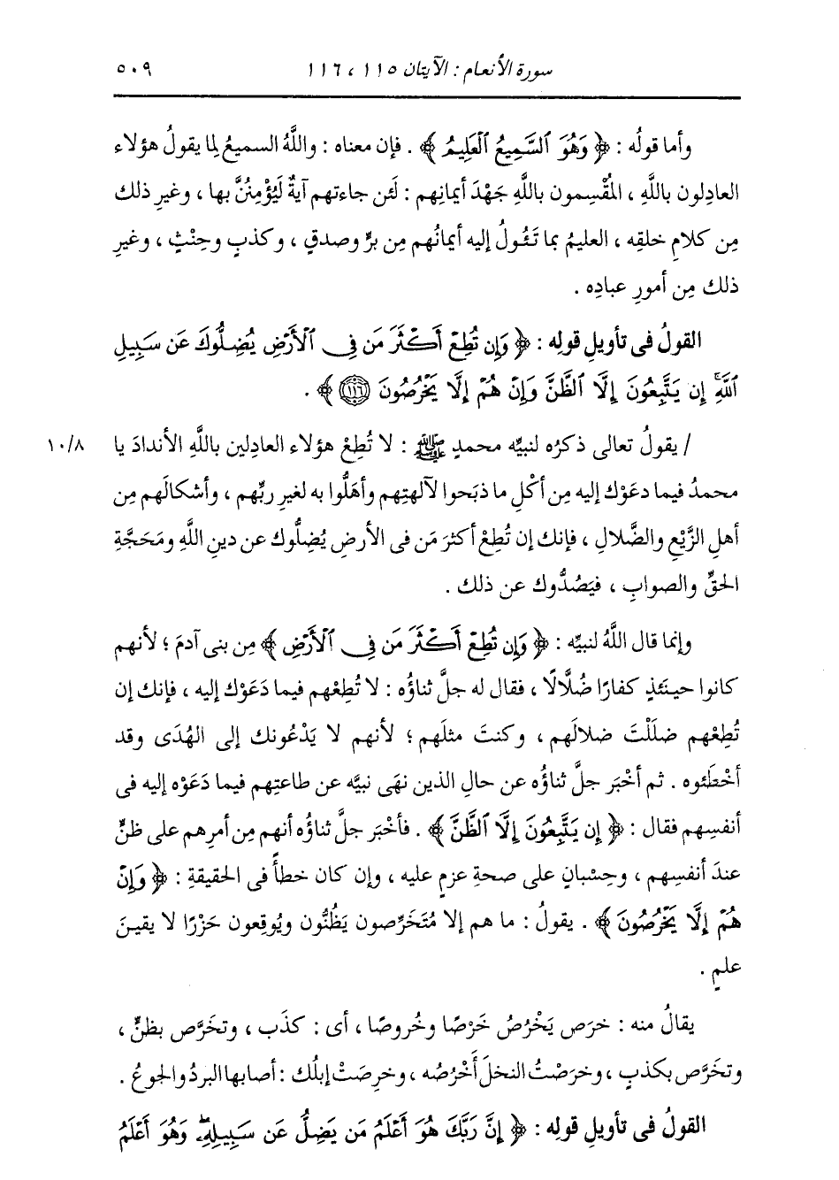 §الْقَوْلُ فِي تَأْوِيلِ قَوْلِهِ تَعَالَى: {وَإِنْ تُطِعْ أَكْثَرَ مَنْ فِي الْأَرْضِ يُضِلُّوكَ عَنْ سَبِيلِ اللَّهِ إِنْ يَتَّبِعُونَ إِلَّا الظَّنَّ وَإِنْ هُمْ إِلَّا يَخْرُصُونَ} [الأنعام: 116] يَقُولُ تَعَالَى ذِكْرُهُ لِنَبِيِّهِ مُحَمَّدٍ صَلَّى اللهُ عَلَيْهِ وَسَلَّمَ: لَا تُطِعْ هَؤُلَاءِ الْعَادِلِينَ بِاللَّهِ الْأَنْدَادَ يَا مُحَمَّدُ فِيمَا دَعَوْكَ إِلَيْهِ مِنْ أَكْلِ مَا ذَبَحُوا لِآلِهَتِهِمْ، وَأَهَلُّوا بِهِ لِغَيْرِ رَبِّهِمْ وَأَشْكَالِهِمْ مِنْ أَهْلِ الزَّيْغِ وَالضَّلَالِ، فَإِنَّكَ إِنْ تُطِعْ أَكْثَرَ مَنْ فِي الْأَرْضِ يُضِلُّوكَ عَنْ دِينِ اللَّهِ وَمَحَجَّةِ الْحَقِّ وَالصَّوَابِ فَيَصُدُّوكَ عَنْ ذَلِكَ. وَإِنَّمَا قَالَ اللَّهُ لِنَبِيِّهِ: {وَإِنْ تُطِعْ أَكْثَرَ مَنْ فِي الْأَرْضِ} [الأنعام: 116] مِنْ بَنِي آدَمَ، لِأَنَّهُمْ كَانُوا حِينَئِذٍ كُفَّارًا ضُلَّالًا، فَقَالَ لَهُ جَلَّ ثَنَاؤُهُ: لَا تُطِعْهُمْ فِيمَا دَعَوْكَ إِلَيْهِ، فَإِنَّكَ إِنْ تُطِعْهُمْ ضَلَلْتَ ضَلَالَهُمْ وَكُنْتَ مِثْلَهُمْ، لِأَنَّهُمْ لَا يَدْعُونَكَ إِلَى الْهُدَى وَقَدْ أَخْطَئُوهُ. ثُمَّ أَخْبَرَ جَلَّ ثَنَاؤُهُ عَنْ حَالِ الَّذِينَ نَهَى نَبِيَّهُ عَنْ طَاعَتِهِمْ فِيمَا دَعَوْهُ إِلَيْهِ فِي أَنْفُسِهِمْ، فَقَالَ: {إِنْ يَتَّبِعُونَ إِلَّا الظَّنَّ} [الأنعام: 116] ، فَأَخْبَرَ جَلَّ ثَنَاؤُهُ أَنَّهُمْ مِنْ أَمْرِهِمْ عَلَى ظَنٍّ عِنْدَ أَنْفُسِهِمْ، وَحُسْبَانٍ عَلَى صِحَّةِ عَزْمٍ عَلَيْهِ وَإِنْ كَانَ خَطَأً فِي الْحَقِيقَةِ. {وَإِنْ هُمْ إِلَّا يَخْرُصُونَ} [الأنعام: 116] يَقُولُ: مَا هُمْ إِلَّا مُتَخَرِّصُونَ يَظُنُّونَ وَيُوقِعُونَ حَزَرًا لَا يَقِينَ عِلْمٍ، يُقَالُ مِنْهُ: خَرَصَ يَخْرُصُ خَرْصًا وَخِرْصًا: أَيْ كَذِبَ، وَتَخَرَّصَ بِظَنٍّ وَتَخَرَّصَ بِكَذِبٍ، وَخَرَصْتُ النَّخْلَ أَخْرُصُهُ، وَخَرِصَتْ إِبِلُكَ: أَصَابَهَا الْبَرْدُ وَالْجُوعُ