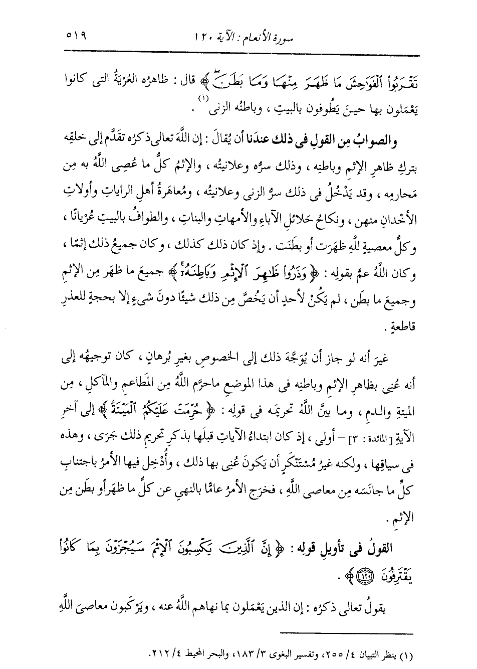 تَقْرَبُوا الْفَوَاحِشَ مَا ظَهَرَ مِنْهَا وَمَا بَطَنَ} [الأنعام: 151] ، قَالَ: " ظَاهِرُهُ الْعُرْيَةُ الَّتِي كَانُوا يَعْمَلُونَ بِهَا حِينَ يَطُوفُونَ بِالْبَيْتِ، وَبَاطِنُهُ: الزِّنَا وَالصَّوَابُ مِنَ الْقَوْلِ فِي ذَلِكَ عِنْدَنَا أَنْ يُقَالَ: إِنَّ اللَّهَ تَعَالَى ذِكْرُهُ تَقَدَّمَ إِلَى خَلْقِهِ بِتَرْكِ ظَاهِرِ الْإِثْمِ وَبَاطِنِهِ وَذَلِكَ سِرُّهُ وَعَلَانِيَتُهُ، وَالْإِثْمُ: كُلُّ مَا عُصِيَ اللَّهُ بِهِ مِنْ مَحَارِمِهِ، وَقَدْ يَدْخُلُ فِي ذَلِكَ سِرُّ الزِّنَا وَعَلَانِيَتُهُ، وَمُعَاهَرَةُ أَهْلِ الرَّايَاتِ وَأُولَاتِ الْأَخْدَانِ مِنْهُنَّ، وَنِكَاحُ حَلَائِلِ الْآبَاءِ وَالْأُمَّهَاتِ وَالْبَنَاتِ، وَالطَّوَافُ بِالْبَيْتِ عُرْيَانًا، وَكُلُّ مَعْصِيَةٍ لِلَّهِ ظَهَرَتْ أَوْ بَطَنَتْ. وَإِذْ كَانَ ذَلِكَ كَذَلِكَ، وَكَانَ جَمِيعُ ذَلِكَ إِثْمًا، وَكَانَ اللَّهُ عَمَّ بَقَوْلِهِ: {وَذَرُوا ظَاهِرَ الْإِثْمِ وَبَاطِنَهُ} [الأنعام: 120] جَمِيعَ مَا ظَهَرَ مِنَ الْإِثْمِ وَجَمِيعَ مَا بَطَنَ، لَمْ يَكُنْ لِأَحَدٍ أَنْ يَخُصَّ مِنْ ذَلِكَ شَيْئًا دُونَ شَيْءٍ إِلَّا بِحُجَّةٍ لِلْعُذْرِ قَاطِعَةً. غَيْرَ أَنَّهُ لَوْ جَازَ أَنْ يُوَجَّهَ ذَلِكَ إِلَى الْخُصُوصِ بِغَيْرِ بُرْهَانٍ، كَانَ تَوْجِيهُهُ إِلَى أَنَّهُ عُنِيَ بِظَاهِرِ الْإِثْمِ وَبَاطِنِهِ فِي هَذَا الْمَوْضِعِ: مَا حَرَّمَ اللَّهُ مِنَ الْمَطَاعِمِ وَالْمَآكِلِ مِنَ الْمَيْتَةِ وَالدَّمِ، وَمَا بَيَّنَ اللَّهُ تَحْرِيمَهُ فِي قَوْلِهِ: {حُرِّمَتْ عَلَيْكُمُ الْمَيْتَةُ} [المائدة: 3] إِلَى آخِرِ الْآيَةِ، أَوْلَى، إِذْ كَانَ ابْتِدَاءُ الْآيَاتِ قَبْلَهَا بِذِكْرِ تَحْرِيمِ ذَلِكَ جَرَى وَهَذِهِ فِي سِيَاقِهَا، وَلَكِنَّهُ غَيْرُ مُسْتَنْكَرٍ أَنْ يَكُونَ عَنَى بِهَا ذَلِكَ، وَأَدْخَلَ فِيهَا الْأَمْرَ بِاجْتِنَابِ كُلِّ مَا جَانَسَهُ مِنْ مَعَاصِي اللَّهِ، فَخَرَجَ الْأَمْرُ عَامًّا بِالنَّهْيِ عَنْ كُلِّ مَا ظَهَرَ أَوْ بَطَنَ مِنَ الْإِثْمِ