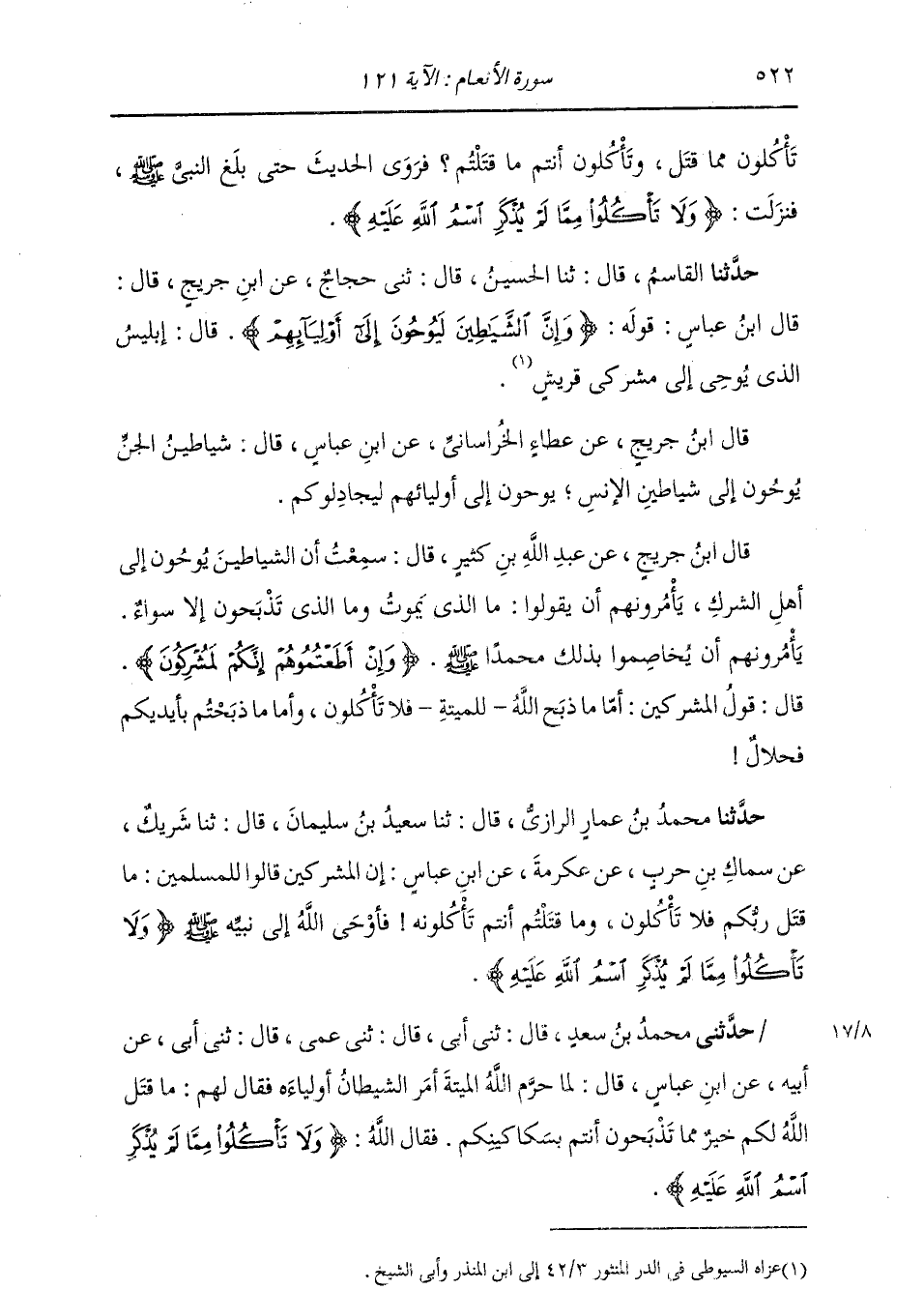 حَدَّثَنَا الْقَاسِمُ، قَالَ: ثنا الْحُسَيْنُ، قَالَ: ثني حَجَّاجٌ، عَنِ ابْنِ جُرَيْجٍ، قَالَ: قَالَ ابْنُ عَبَّاسٍ، قَوْلُهُ: {§وَإِنَّ الشَّيَاطِينَ لَيُوحُونَ إِلَى أَوْلِيَائِهِمْ} [الأنعام: 121] قَالَ: «إِبْلِيسُ الَّذِي يُوحِي إِلَى مُشْرِكِي قُرَيْشٍ» قَالَ ابْنُ جُرَيْجٍ، عَنْ عَطَاءٍ الْخُرَاسَانِيِّ، عَنِ ابْنِ عَبَّاسٍ قَالَ: «شَيَاطِينُ الْجِنِّ يُوحُونَ إِلَى شَيَاطِينِ الْإِنْسِ، يُوحُونَ إِلَى أَوْلِيَائِهِمْ لِيُجَادِلُوكُمْ» قَالَ ابْنُ جُرَيْجٍ، عَنْ عَبْدِ اللَّهِ بْنِ كَثِيرٍ قَالَ: سَمِعْتُ أَنَّ الشَّيَاطِينَ يُوحُونَ إِلَى أَهْلِ الشِّرْكِ يَأْمُرُونَهُمْ أَنْ يَقُولُوا: مَا الَّذِي يَمُوتُ وَمَا الَّذِي تَذْبَحُونَ إِلَّا سَوَاءٌ، يَأْمُرُونَهُمْ أَنْ يُخَاصِمُوا بِذَلِكَ مُحَمَّدًا صَلَّى اللهُ عَلَيْهِ وَسَلَّمَ، {وَإِنْ أَطَعْتُمُوهُمْ إِنَّكُمْ لَمُشْرِكُونَ} [الأنعام: 121] قَالَ: قَوْلُ الْمُشْرِكِينَ: أَمَّا مَا ذَبَحَ اللَّهُ لِلْمَيْتَةِ فَلَا تَأْكُلُونَ، وَأَمَّا مَا ذَبَحْتُمْ بِأَيْدِيكُمْ فَحَلَالٌ