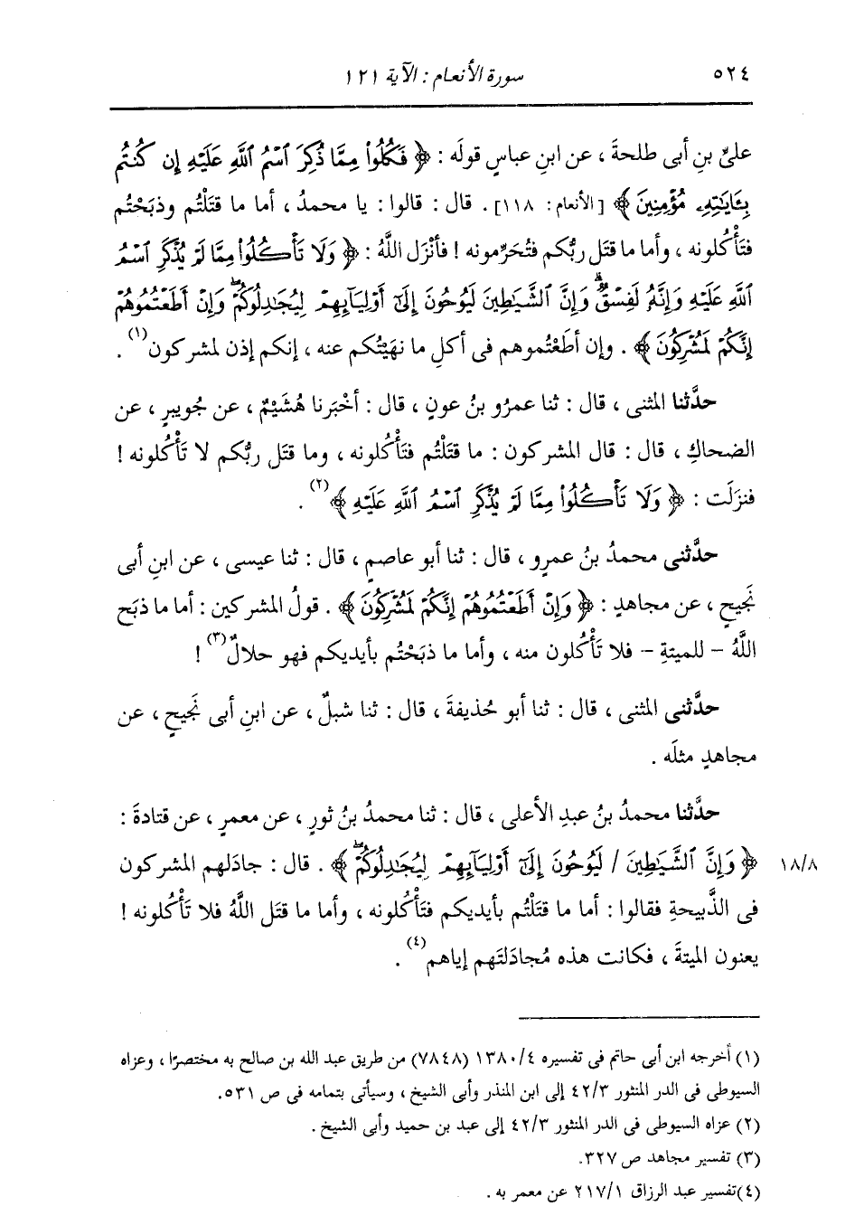 حَدَّثَنِي مُحَمَّدُ بْنُ عَمْرٍو، قَالَ: ثنا أَبُو عَاصِمٍ، قَالَ: ثنا عِيسَى، عَنِ ابْنِ أَبِي نَجِيحٍ، عَنْ مُجَاهِدٍ: {§وَإِنَّ أَطَعْتُمُوهُمْ إِنَّكُمْ لَمُشْرِكُونَ} [الأنعام: 121] قَوْلُ الْمُشْرِكِينَ: أَمَّا مَا ذَبَحَ اللَّهُ لِلْمَيْتَةِ فَلَا تَأْكُلُونَ مِنْهُ، وَأَمَّا مَا ذَبَحْتُمْ بِأَيْدِيكُمْ فَهُوَ حَلَالٌ؟ " حَدَّثَنِي الْمُثَنَّى قَالَ: ثنا أَبُو حُذَيْفَةَ قَالَ: ثنا شِبْلٌ، عَنِ ابْنِ أَبِي نَجِيحٍ، عَنْ مُجَاهِدٍ، مِثْلَهُ