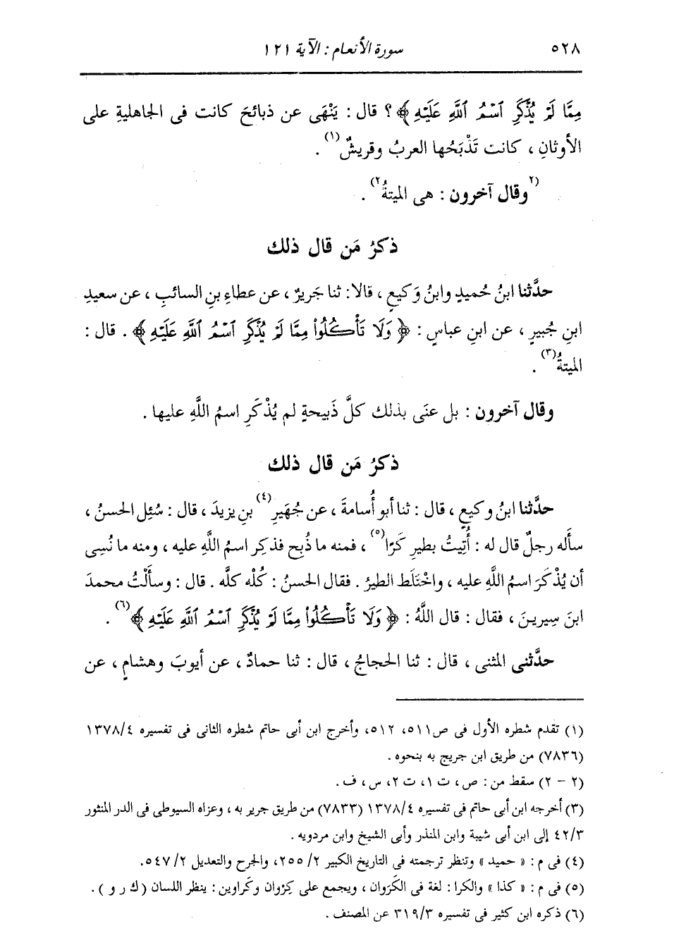 ذِكْرُ مَنْ قَالَ ذَلِكَ: حَدَّثَنَا ابْنُ حُمَيْدٍ، وَابْنُ وَكِيعٍ، قَالَا: ثنا جَرِيرٌ، عَنْ عَطَاءِ بْنِ السَّائِبِ، عَنْ سَعِيدِ بْنِ جُبَيْرٍ، عَنِ ابْنِ عَبَّاسٍ: {§وَلَا تَأْكُلُوا مِمَّا لَمْ يُذْكَرِ اسْمُ اللَّهِ عَلَيْهِ} [الأنعام: 121] قَالَ: «الْمَيْتَةُ» وَقَالَ آخَرُونَ: بَلْ عَنَى بِذَلِكَ كُلَّ ذَبِيحَةٍ لَمْ يُذْكَرِ اسْمُ اللَّهِ عَلَيْهَا