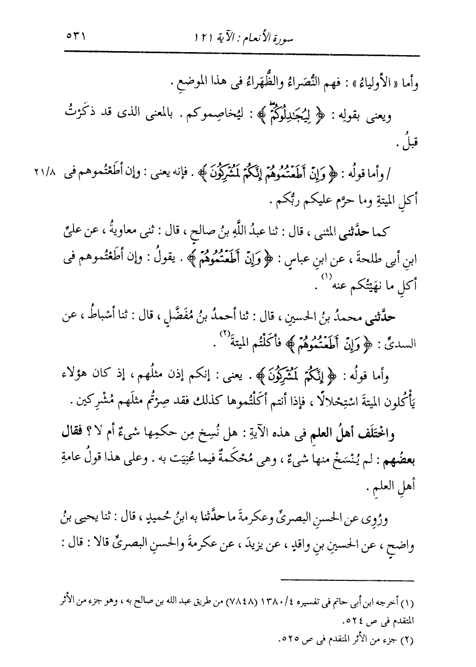 كَمَا حَدَّثَنِي الْمُثَنَّى، قَالَ: ثنا عَبْدُ اللَّهِ بْنُ صَالِحٍ، قَالَ: ثنا مُعَاوِيَةُ، عَنْ عَلِيِّ بْنِ أَبِي طَلْحَةَ، عَنِ ابْنِ عَبَّاسٍ: {§وَإِنْ أَطَعْتُمُوهُمْ} [الأنعام: 121] يَقُولُ: «وَإِنْ أَطَعْتُمُوهُمْ فِي أَكْلِ مَا نَهَيْتُكُمْ عَنْهُ»