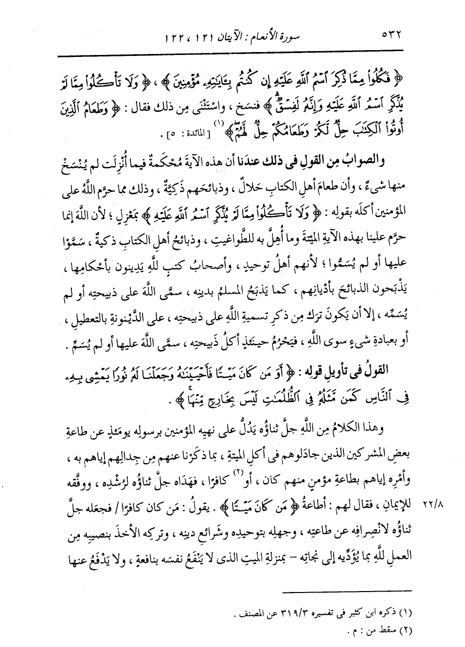 : {§فَكُلُوا مِمَّا ذُكِرَ اسْمُ اللَّهِ عَلَيْهِ إِنْ كُنْتُمْ بِآيَاتِهِ مُؤْمِنِينَ} [الأنعام: 118] ، {وَلَا تَأْكُلُوا مِمَّا لَمْ يُذْكَرِ اسْمُ اللَّهِ عَلَيْهِ وَإِنَّهُ لَفِسْقٌ} [الأنعام: 121] ، فَنَسَخَ وَاسْتَثْنَى مِنْ ذَلِكَ فَقَالَ: {وَطَعَامُ الَّذِينَ أُوتُوا الْكِتَابَ حِلٌّ لَكُمْ وَطَعَامُكُمْ حِلٌّ لَهُمْ} [المائدة: 5] وَالصَّوَابُ مِنَ الْقَوْلِ فِي ذَلِكَ عِنْدَنَا، أَنَّ هَذِهِ الْآيَةَ مُحْكَمَةٌ فِيمَا أُنْزِلَتْ لَمْ يُنْسَخْ مِنْهَا شَيْءٌ، وَأَنَّ طَعَامَ أَهْلِ الْكِتَابِ حَلَالٌ، وَذَبَائِحَهُمْ ذَكِيَّةٌ. وَذَلِكَ مِمَّا حَكَمَ اللَّهُ عَلَى الْمُؤْمِنِينَ أَكْلَهُ بِقَوْلِهِ: {وَلَا تَأْكُلُوا مِمَّا لَمْ يُذْكَرِ اسْمُ اللَّهِ عَلَيْهِ} [الأنعام: 121] بِمَعْزِلٍ، لِأَنَّ اللَّهَ إِنَّمَا حَرَّمَ عَلَيْنَا بِهَذِهِ الْآيَةَ الْمَيْتَةَ وَمَا أُهِلَّ بِهِ لِلطَّوَاغِيتِ، وَذَبَائِحُ أَهْلِ الْكِتَابِ ذَكِيَّةٌ سَمَّوْا عَلَيْهَا أَوْ لَمْ يُسَمُّوا، لِأَنَّهُمْ أَهْلُ تَوْحِيدٍ وَأَصْحَابُ كُتُبٍ لِلَّهِ يَدِينُونَ بِأَحْكَامِهَا، يَذْبَحُونَ الذَّبَائِحَ بِأَدْيَانِهِمْ كَمَا ذَبَحَ الْمُسْلِمُ بِدِينِهِ، سَمَّى اللَّهَ عَلَى ذَبِيحَتِهِ أَوْ لَمْ يُسَمِّهِ، إِلَّا أَنْ يَكُونَ تَرَكَ مِنْ ذِكْرِ تَسْمِيَةِ اللَّهِ عَلَى ذَبِيحَتِهِ عَلَى الدَّيْنُونَةِ بِالتَّعْطِيلِ، أَوْ بِعِبَادَةِ شَيْءٍ سِوَى اللَّهِ، فَيَحْرُمُ حِينَئِذٍ أَكْلُ ذَبِيحَتِهِ سَمَّى اللَّهَ عَلَيْهَا أَوْ لَمْ يُسَمِّ