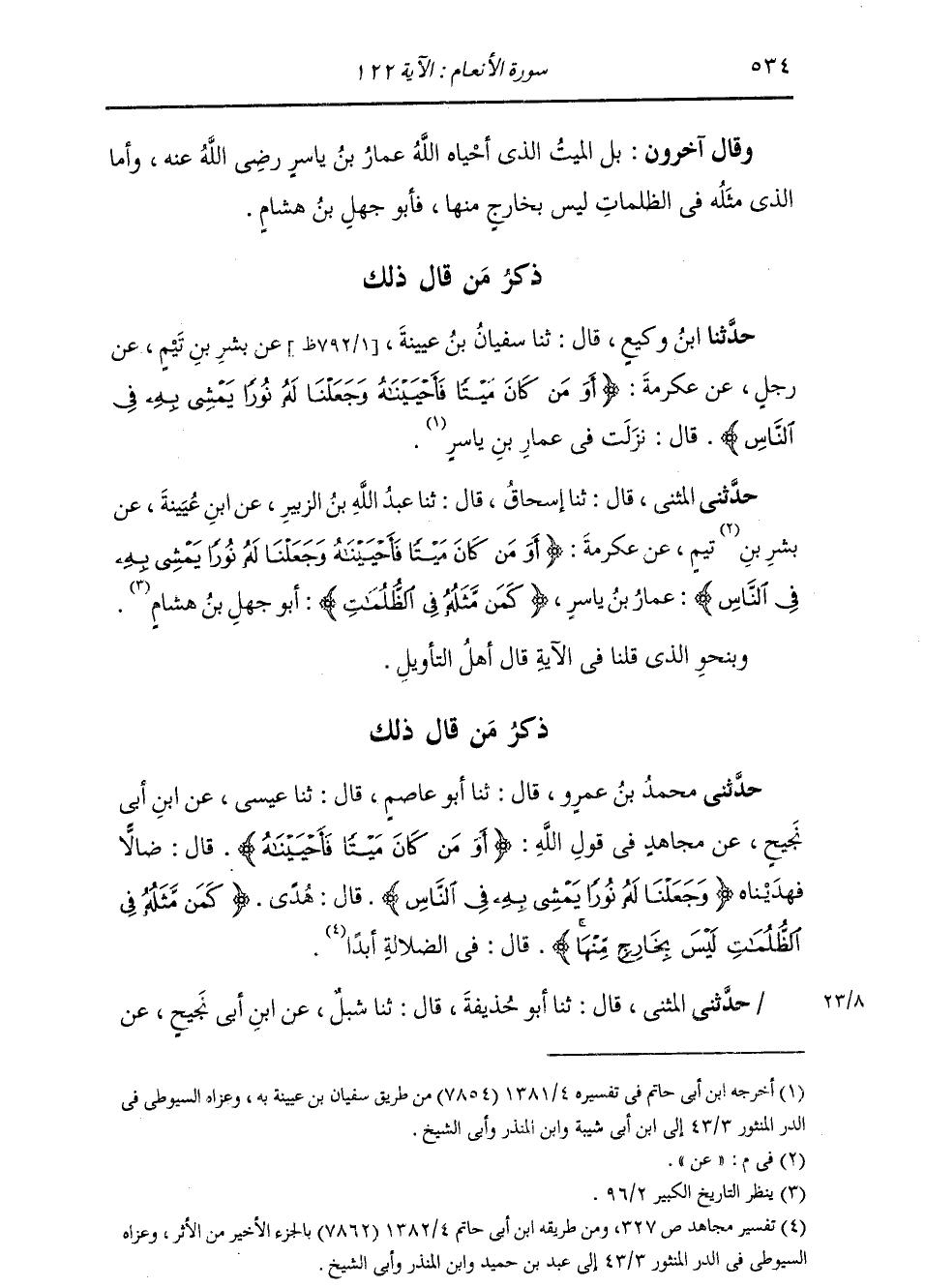 حَدَّثَنِي الْمُثَنَّى، قَالَ: ثنا إِسْحَاقُ، قَالَ: ثنا عَبْدُ اللَّهِ بْنُ الزُّبَيْرِ، عَنِ ابْنِ عُيَيْنَةَ، عَنْ بِشْرٍ، عَنْ تَيْمٍ، عَنْ عِكْرِمَةَ: {§أَوَمَنْ كَانَ مَيْتًا فَأَحْيَيْنَاهُ وَجَعَلْنَا لَهُ نُورًا يَمْشِي بِهِ فِي النَّاسِ} : عَمَّارُ بْنُ يَاسِرٍ. {كَمَنْ مَثَلُهُ فِي الظُّلُمَاتِ} [الأنعام: 122] : أَبُو جَهْلِ بْنُ هِشَامٍ وَبِنَحْوِ الَّذِي قُلْنَا فِي الْآيَةِ قَالَ أَهْلُ التَّأْوِيلِ