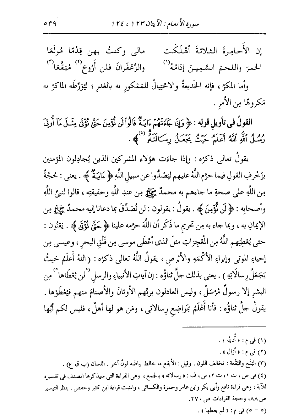 §الْقَوْلُ فِي تَأْوِيلِ قَوْلِهِ تَعَالَى: {وَإِذَا جَاءَتْهُمْ آيَةٌ قَالُوا لَنْ نُؤْمِنَ حَتَّى نُؤْتَى مِثْلَ مَا أُوتِيَ رُسُلُ اللَّهِ اللَّهُ أَعْلَمُ حَيْثُ يَجْعَلُ رِسَالَتَهُ سَيُصِيبُ الَّذِينَ أَجْرَمُوا صَغَارٌ عِنْدَ اللَّهِ وَعَذَابٌ شَدِيدٌ بِمَا كَانُوا يَمْكُرُونَ} [الأنعام: 124] يَقُولُ تَعَالَى ذِكْرُهُ: وَإِذَا جَاءَتْ هَؤُلَاءِ الْمُشْرِكِينَ الَّذِينَ يُجَادِلُونَ الْمُؤْمِنِينَ بِزُخْرُفِ الْقَوْلِ فِيمَا حَرَّمَ اللَّهُ عَلَيْهِمْ لِيَصُدُّوا عَنْ سَبِيلِ اللَّهِ {آيَةٌ} [البقرة: 106] يَعْنِي: حُجَّةٌ مِنَ اللَّهِ عَلَى صِحَّةِ مَا جَاءَهُمْ بِهِ مُحَمَّدٌ صَلَّى اللهُ عَلَيْهِ وَسَلَّمَ مِنْ عِنْدِ اللَّهِ وَحَقِيقَتِهِ، قَالُوا لِنَبِيِّ اللَّهِ وَأَصْحَابِهِ: {لَنْ نُؤْمِنَ} [البقرة: 55] يَقُولُ: يَقُولُونَ: لَنْ نُصَدِّقَ بِمَا دَعَانَا إِلَيْهِ مُحَمَّدٌ صَلَّى اللهُ عَلَيْهِ وَسَلَّمَ مِنَ الْإِيمَانِ بِهِ، وَبِمَا جَاءَ بِهِ مِنْ تَحْرِيمِ مَا ذَكَرَ أَنَّ اللَّهَ حَرَّمَهُ عَلَيْنَا، {حَتَّى نُؤْتَى} [الأنعام: 124] يَعْنُونَ: حَتَّى يُعْطِيَهُمُ اللَّهُ مِنَ الْمُعْجِزَاتِ مِثْلَ الَّذِي أَعْطَى مُوسَى مِنْ فَلْقِ الْبَحْرِ، وَعِيسَى مِنْ إِحْيَاءِ الْمَوْتَى وَإِبْرَاءِ الْأَكْمَهِ وَالْأَبْرَصِ. يَقُولُ تَعَالَى ذِكْرُهُ: {اللَّهُ أَعْلَمُ حَيْثُ يَجْعَلُ رِسَالَتَهُ} [الأنعام: 124] يَعْنِي بِذَلِكَ جَلَّ ثَنَاؤُهُ: أَنَّ آيَاتِ الْأَنْبِيَاءِ وَالرُّسُلِ لَمْ يُعْطَهَا مِنَ الْبَشَرِ إِلَّا رَسُولٌ مُرْسَلٌ، وَلَيْسَ الْعَادِلُونَ بِرَبِّهِمُ الْأَوْثَانَ وَالْأَصْنَامَ مِنْهُمْ فَيُعْطَوْهَا. يَقُولُ جَلَّ ثَنَاؤُهُ: فَأَنَا أَعْلَمُ بِمَوَاضِعِ رِسَالَاتِي وَمَنْ هُوَ لَهَا أَهْلٌ، فَلَيْسَ لَكُمْ أَيُّهَا