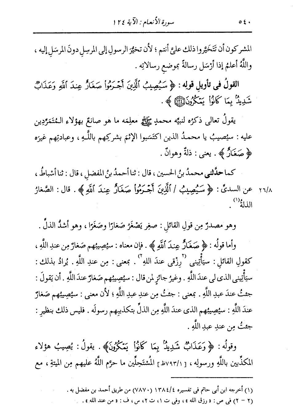 §الْقَوْلُ فِي تَأْوِيلِ قَوْلِهِ تَعَالَى: {سَيُصِيبُ الَّذِينَ أَجْرَمُوا صَغَارٌ عِنْدَ اللَّهِ وَعَذَابٌ شَدِيدٌ بِمَا كَانُوا يَمْكُرُونَ} [الأنعام: 124] يَقُولُ تَعَالَى ذِكْرُهُ لِنَبِيِّهِ مُحَمَّدٍ صَلَّى اللهُ عَلَيْهِ وَسَلَّمَ، مُعَلِّمَهُ مَا هُوَ صَانِعٌ بِهَؤُلَاءِ الْمُتَمَرِّدِينَ عَلَيْهِ: سَيُصِيبُ يَا مُحَمَّدُ الَّذِي اكْتَسَبُوا الْإِثْمَ بِشِرْكِهِمْ بِاللَّهِ وَعِبَادَتِهِمْ غَيْرَهُ {صَغَارٌ} [الأنعام: 124] يَعْنِي: ذِلَّةٌ وَهَوَانٌ