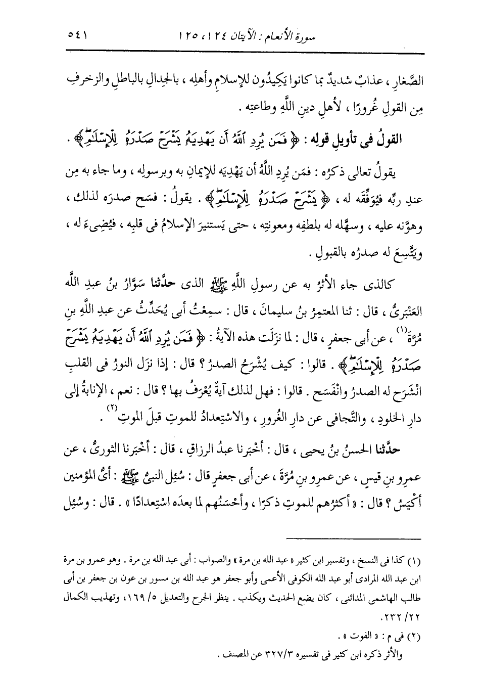 §الْقَوْلُ فِي تَأْوِيلِ قَوْلِهِ تَعَالَى: {فَمَنْ يُرِدِ اللَّهُ أَنْ يَهْدِيَهُ يَشْرَحْ صَدْرَهُ لِلْإِسْلَامِ وَمَنْ يُرِدْ أَنْ يُضِلَّهُ يَجْعَلْ صَدْرَهُ ضَيِّقًا حَرَجًا كَأَنَّمَا يَصَّعَّدُ فِي السَّمَاءِ كَذَلِكَ يَجْعَلُ اللَّهُ الرِّجْسَ عَلَى الَّذِينَ لَا يُؤْمِنُونَ} [الأنعام: 125] يَقُولُ تَعَالَى ذِكْرُهُ: {فَمَنْ يُرِدِ اللَّهُ أَنْ يَهْدِيَهُ} [الأنعام: 125] لِلْإِيمَانِ بِهِ وَبِرَسُولِهِ وَمَا جَاءَ بِهِ مِنْ عِنْدِ رَبِّهِ فَيُوَفِّقُهُ لَهُ، {يَشْرَحْ صَدْرَهُ لِلْإِسْلَامِ} [الأنعام: 125] يَقُولُ: فَسَّحَ صَدْرَهُ لِذَلِكَ وَهَوَّنَهُ عَلَيْهِ وَسَهَّلَهُ لَهُ بِلُطْفِهِ وَمَعُونَتِهِ، حَتَّى يَسْتَنِيرَ الْإِسْلَامُ فِي قَلْبِهِ، فَيُضِيءُ لَهُ وَيَتَّسِعُ لَهُ صَدْرُهُ بِالْقَبُولِ. كَالَّذِي جَاءَ الْأَثَرُ بِهِ عَنْ رَسُولِ اللَّهِ صَلَّى اللهُ عَلَيْهِ وَسَلَّمَ