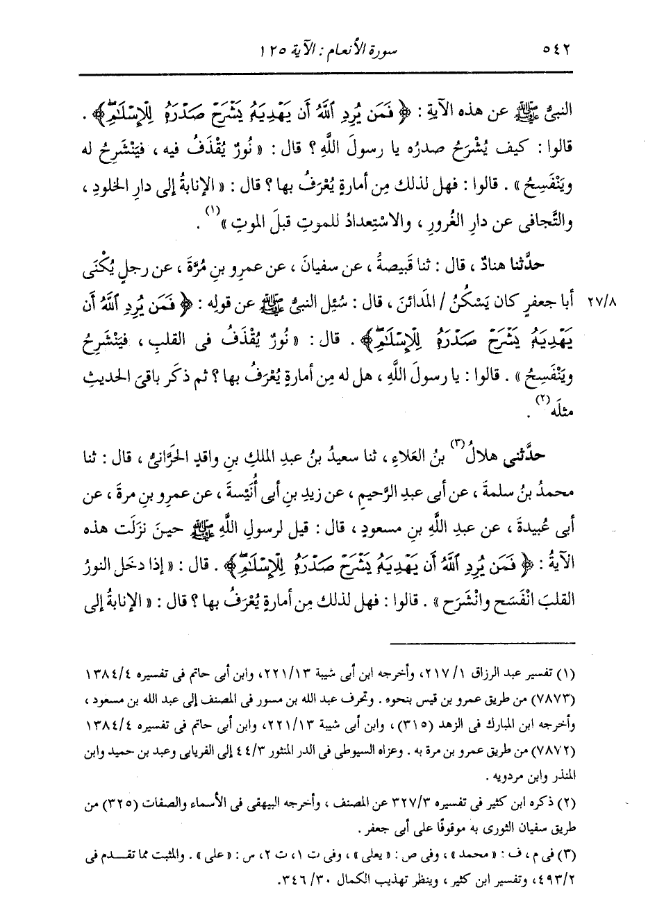 حَدَّثَنَا هَنَّادٌ قَالَ: ثنا قَبِيصَةُ، عَنْ سُفْيَانَ، عَنْ عَمْرِو بْنِ مُرَّةَ، عَنْ رَجُلٍ يُكَنَّى أَبَا جَعْفَرٍ كَانَ يَسْكُنُ الْمَدَائِنَ قَالَ: سُئِلَ النَّبِيُّ صَلَّى اللهُ عَلَيْهِ وَسَلَّمَ عَنْ قَوْلِهِ: {فَمَنْ يُرِدِ اللَّهُ أَنْ يَهْدِيَهُ يَشْرَحْ صَدْرَهُ لِلْإِسْلَامِ} [الأنعام: 125] قَالَ: «§نُورٌ يُقْذَفُ فِي الْقَلْبِ فَيَنْشَرِحُ وَيَنْفَسِحُ» قَالُوا: يَا رَسُولَ اللَّهِ، هَلْ لَهُ مِنْ أَمَارَةٍ يُعْرَفُ بِهَا؟ " ثُمَّ ذَكَرَ بَاقِي الْحَدِيثَ مِثْلَهُ