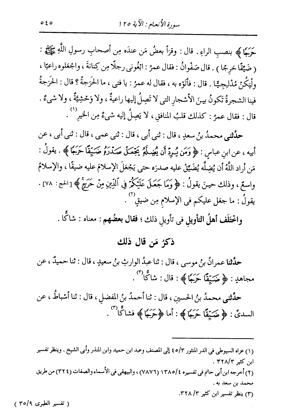 حَدَّثَنِي مُحَمَّدُ بْنُ سَعْدٍ، قَالَ: ثني أَبِي قَالَ: ثني عَمِّي قَالَ: ثني أَبِي، عَنْ أَبِيهِ، عَنِ ابْنِ عَبَّاسٍ: {وَمَنْ يُرِدْ أَنْ يُضِلَّهُ، يَجْعَلْ صَدْرَهُ ضَيِّقًا حَرَجًا} [الأنعام: 125] ، يَقُولُ: " §مَنْ أَرَادَ اللَّهُ أَنْ يُضِلَّهُ يُضَيِّقُ عَلَيْهِ صَدْرَهُ حَتَّى يَجْعَلَ الْإِسْلَامَ عَلَيْهِ ضَيِّقًا، وَالْإِسْلَامُ وَاسِعٌ، وَذَلِكَ حِينَ يَقُولُ: {وَمَا جَعَلَ عَلَيْكُمْ فِي الدِّينِ مِنْ حَرَجٍ} [الحج: 78] ، يَقُولُ: مَا جَعَلَ عَلَيْكُمْ فِي الْإِسْلَامِ مِنْ ضِيقٍ " وَاخْتَلَفَ أَهْلُ التَّأْوِيلِ فِي تَأْوِيلِ ذَلِكَ، فَقَالَ بَعْضُهُمْ: مَعْنَاهُ: شَاكًّا