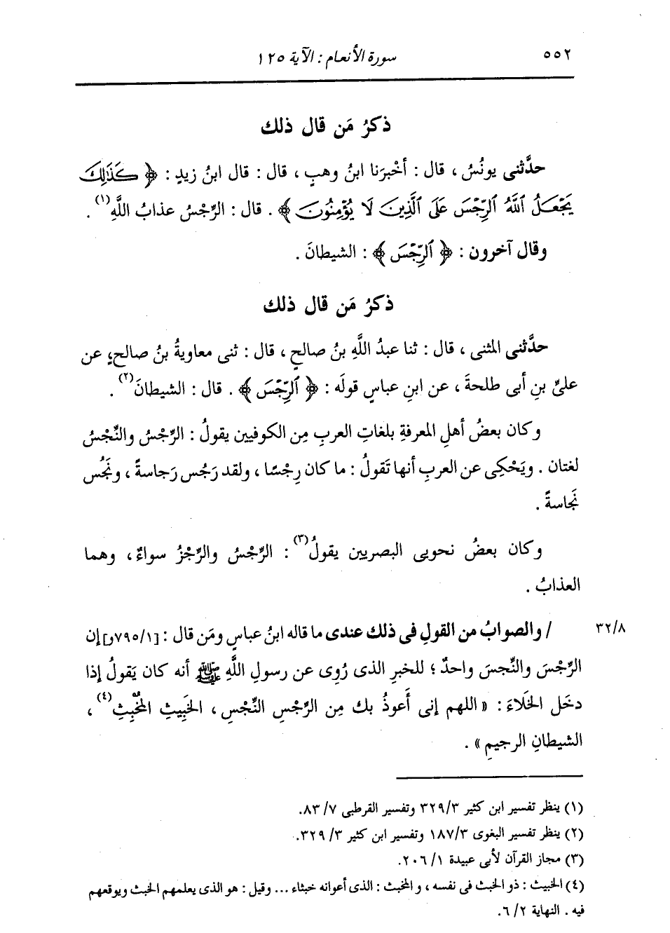 ذِكْرُ مَنْ قَالَ ذَلِكَ حَدَّثَنِي الْمُثَنَّى، قَالَ: ثنا عَبْدُ اللَّهِ بْنُ صَالِحٍ، قَالَ: ثني مُعَاوِيَةُ بْنُ صَالِحٍ، عَنْ عَلِيِّ بْنِ أَبِي طَلْحَةَ، عَنِ ابْنِ عَبَّاسٍ، قَوْلُهُ: {§الرِّجْسُ} [الأنعام: 125] قَالَ: «الشَّيْطَانُ» وَكَانَ بَعْضُ أَهْلِ الْمَعْرِفَةِ بِلُغَاتِ الْعَرَبِ مِنَ الْكُوفِيِّينَ يَقُولُ: الرِّجْسُ وَالنِّجْسُ لُغَتَانِ. وَيُحْكَى عَنِ الْعَرَبِ أَنَّهَا تَقُولُ: مَا كَانَ رِجْسًا، وَلَقَدْ رَجُسَ رَجَاسَةً، وَنَجُسَ نَجَاسَةً. وَكَانَ بَعْضُ نَحْوِيِّي الْبَصْرِيِّينَ يَقُولُ: الرِّجْسُ وَالرِّجْزُ سَوَاءٌ، وَهُمَا الْعَذَابُ وَالصَّوَابُ فِي ذَلِكَ مِنَ الْقَوْلِ عِنْدِي مَا قَالَهُ ابْنُ عَبَّاسٍ، وَمَنْ قَالَ: إِنَّ الرِّجْسَ وَالنَّجِسَ وَاحِدٌ، لِلْخَبَرِ الَّذِي رُوِي