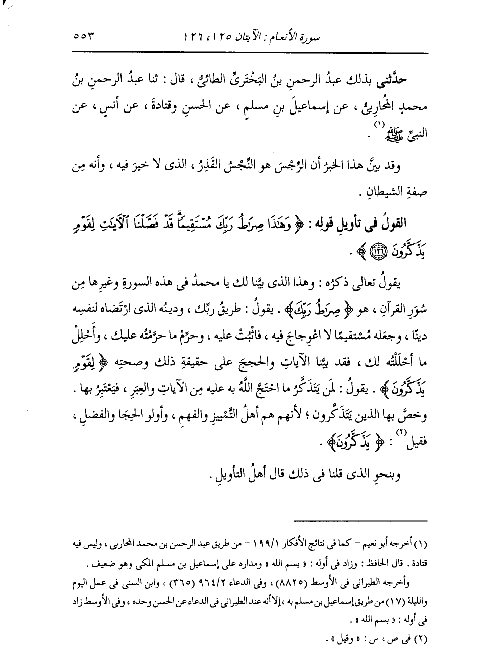 §الْقَوْلُ فِي تَأْوِيلِ قَوْلِهِ تَعَالَى: {وَهَذَا صِرَاطُ رَبِّكَ مُسْتَقِيمًا قَدْ فَصَّلْنَا الْآيَاتِ لِقَوْمٍ يَذَّكَّرُونَ} [الأنعام: 126] يَقُولُ تَعَالَى ذِكْرُهُ: وَهَذَا الَّذِي بَيَّنَّا لَكَ يَا مُحَمَّدُ فِي هَذِهِ السُّورَةِ وَغَيْرِهَا مِنْ سُوَرِ الْقُرْآنِ، هُوَ صِرَاطُ رَبِّكَ، يَقُولُ: طَرِيقُ رَبِّكَ وَدِينُهُ الَّذِي ارْتَضَاهُ لِنَفْسِهِ دِينًا وَجَعَلَهُ مُسْتَقِيمًا لَا اعْوِجَاجَ فِيهِ، فَاثْبُتْ عَلَيْهِ، وَحَرِّمْ مَا حَرَّمْتُهُ عَلَيْكَ، وَأَحْلِلْ مَا أَحْلَلْتُهُ لَكَ، فَقَدْ بَيَّنَّا الْآيَاتِ وَالْحُجَجَ عَلَى حَقِيقَةِ ذَلِكَ وَصِحَّتِهِ لِقَوْمٍ يَذَّكَّرُونَ، يَقُولُ: لِمَنْ يَتَذَكَّرُ مَا احْتَجَّ اللَّهُ بِهِ عَلَيْهِ مِنَ الْآيَاتِ وَالْعِبَرِ، فَيَعْتَبِرُ بِهَا. وَخَصَّ بِهَا الَّذِينَ يَتَذَكَّرُونَ، لِأَنَّهُمْ هُمْ أَهْلُ التَّمْيِيزِ وَالْفَهْمِ وَأُولُو الْحِجَا وَالْفَضْلِ، فَقِيلَ: يَذَّكَّرُونَ. وَبِنَحْوِ الَّذِي قُلْنَا فِي ذَلِكَ قَالَ أَهْلُ التَّأْوِيلِ
