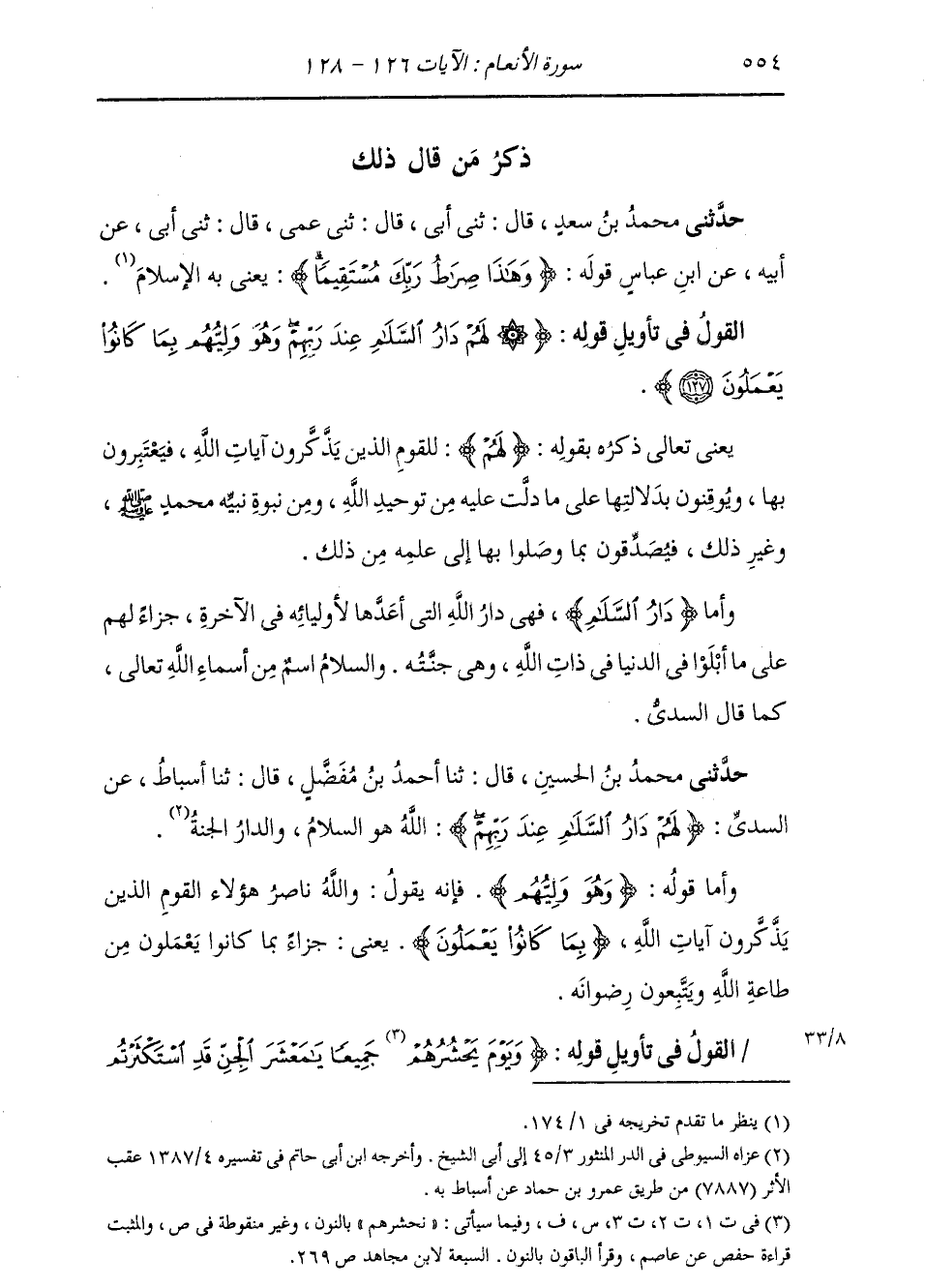 §الْقَوْلُ فِي تَأْوِيلِ قَوْلِهِ تَعَالَى: {لَهُمْ دَارُ السَّلَامِ عِنْدَ رَبِّهِمْ وَهُوَ وَلِيُّهُمْ بِمَا كَانُوا يَعْمَلُونَ} [الأنعام: 127] يَعْنِي تَعَالَى ذِكْرُهُ بِقَوْلِهِ: {لَهُمْ} [البقرة: 11] : لِلْقَوْمِ الَّذِينَ يَذَّكَّرُونَ آيَاتِ اللَّهِ فَيَعْتَبِرُونَ بِهَا وَيُوقِنُونَ بِدَلَالَتِهَا عَلَى مَا دَلَّتْ عَلَيْهِ مِنْ تَوْحِيدِ اللَّهِ، وَمِنْ نُبُوَّةِ نَبِيِّهِ مُحَمَّدٍ صَلَّى اللهُ عَلَيْهِ وَسَلَّمَ، وَغَيْرِ ذَلِكَ، فَيُصَدِّقُونَ بِمَا وَصَلُوا بِهَا إِلَى عِلْمِهِ مِنْ ذَلِكَ. وَأَمَّا دَارُ السَّلَامِ، فَهِيَ دَارُ اللَّهِ الَّتِي أَعَدَّهَا لِأَوْلِيَائِهِ فِي الْآخِرَةِ جَزَاءً لَهُمْ عَلَى مَا أَبْلَوْا فِي الدُّنْيَا فِي ذَاتِ اللَّهِ، وَهِيَ جَنَّتُهُ. وَالسَّلَامُ: اسْمٌ مِنْ أَسْمَاءِ اللَّهِ تَعَالَى، كَمَا قَالَ السُّدِّيُّ