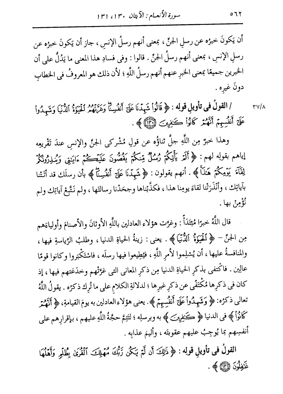 §الْقَوْلُ فِي تَأْوِيلِ قَوْلِهِ تَعَالَى: {قَالُوا شَهِدْنَا عَلَى أَنْفُسِنَا وَغَرَّتْهُمُ الْحَيَاةُ الدُّنْيَا وَشَهِدُوا عَلَى أَنْفُسِهِمْ أَنَّهُمْ كَانُوا كَافِرِينَ} [الأنعام: 130] وَهَذَا خَبَرٌ مِنَ اللَّهِ جَلَّ ثَنَاؤُهُ عَنْ قَوْلِ مُشْرِكِي الْجِنِّ وَالْإِنْسِ عِنْدَ تَقْرِيعِهِ إِيَّاهُمْ بِقَوْلِهِ لَهُمْ: {أَلَمْ يَأْتِكُمْ رُسُلٌ مِنْكُمْ يَقُصُّونَ عَلَيْكُمْ آيَاتِي وَيُنْذِرُونَكُمْ لِقَاءَ يَوْمِكُمْ هَذَا} [الأنعام: 130] ؟ أَنَّهُمْ يَقُولُونَ: {شَهِدْنَا عَلَى أَنْفُسِنَا} [الأنعام: 130] بِأَنَّ رُسُلَكَ قَدْ أَتَتْنَا بِآيَاتِكَ، وَأَنْذَرَتْنَا لِقَاءَ يَوْمِنَا هَذَا، فَكَذَّبْنَاهَا وَجَحَدْنَا رِسَالَتَهَا، وَلَمْ نَتَّبِعْ آيَاتِكَ وَلَمْ نُؤْمِنْ بِهَا. قَالَ اللَّهُ خَبَرًا مُبْتَدَأً: وَغَرَّتْ هَؤُلَاءِ الْعَادِلِينَ بِاللَّهِ الْأَوْثَانَ وَالْأَصْنَامَ وَأَوْلِيَاءَهُمْ مِنَ الْجِنِّ {الْحَيَاةُ الدُّنْيَا} [البقرة: 85] يَعْنِي: زِينَةَ الْحَيَاةِ الدُّنْيَا، وَطَلَبَ الرِّيَاسَةَ فِيهَا، وَالْمُنَافَسَةَ عَلَيْهَا، أَنْ يُسْلِمُوا لِأَمْرِ اللَّهِ فَيُطِيعُوا فِيهَا رُسُلَهُ، فَاسْتَكْبَرُوا وَكَانُوا قَوْمًا عَالِينَ. فَاكْتَفَى بِذِكْرِ الْحَيَاةِ الدُّنْيَا مِنْ ذِكْرِ الْمَعَانِي الَّتِي غَرَّتْهُمْ وَخَدَعَتْهُمْ فِيهَا، إِذْ كَانَ فِي ذِكْرِهَا مُكْتَفًى عَنْ ذِكْرِ غَيْرِهَا لِدَلَالَةِ الْكَلَامِ عَلَى مَا تَرَكَ ذِكْرَهُ، يَقُولُ اللَّهُ تَعَالَى: {وَشَهِدُوا عَلَى أَنْفُسِهِمْ} [الأنعام: 130] يَعْنِي هَؤُلَاءِ الْعَادِلِينَ بِهِ يَوْمَ الْقِيَامَةِ أَنَّهُمْ كَانُوا فِي الدُّنْيَا كَافِرِينَ بِهِ وَبِرُسُلِهِ، لِتَتِمَّ حُجَّةُ اللَّهِ عَلَيْهِمْ بِإِقْرَارِهِمْ عَلَى أَنْفُسِهِمْ بِمَا يُوجِبُ عَلَيْهِمْ عُقُوبَتَهُ وَأَلِيمَ عَذَابِهِ