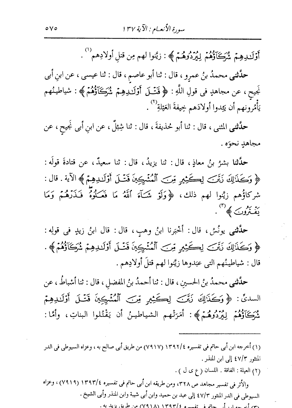 حَدَّثَنِي مُحَمَّدُ بْنُ عَمْرٍو، قَالَ: ثنا أَبُو عَاصِمٍ، قَالَ: ثنا عِيسَى، عَنِ ابْنِ أَبِي نَجِيحٍ، عَنْ مُجَاهِدٍ، فِي قَوْلِ اللَّهِ: {قَتْلَ أَوْلَادِهِمْ شُرَكَاؤُهُمْ} [الأنعام: 137] : «§شَيَاطِينُهُمْ يَأْمُرُونَهُمْ أَنْ يَئِدُوا أَوْلَادَهُمْ خِيفَةَ الْعَيْلَةِ» حَدَّثَنِي الْمُثَنَّى قَالَ: ثنا أَبُو حُذَيْفَةَ قَالَ: ثنا شِبْلٌ، عَنِ ابْنِ أَبِي نَجِيحٍ، عَنْ مُجَاهِدٍ، نَحْوَهُ