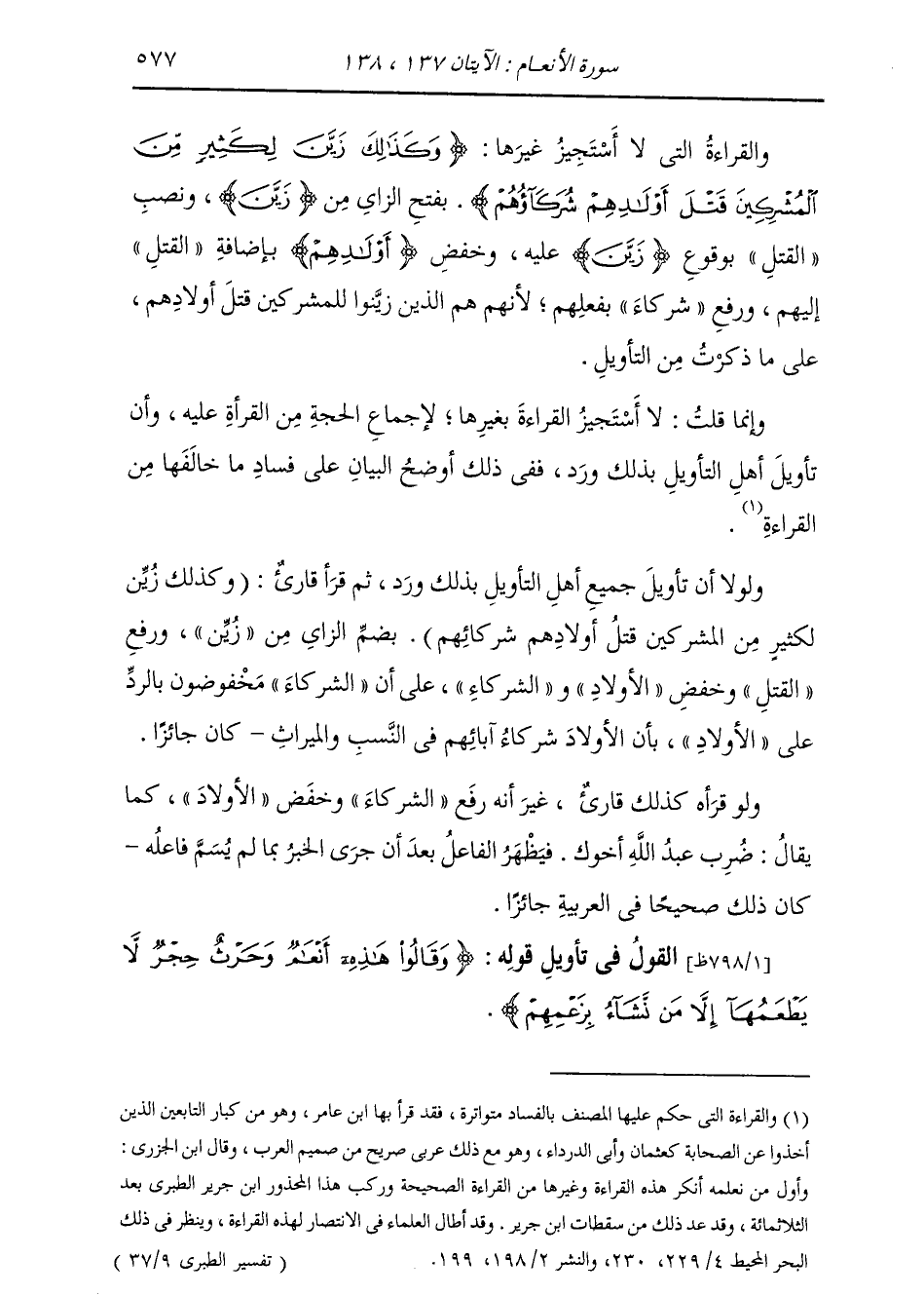 وَالْقِرَاءَةُ الَّتِي لَا أَسْتَجِيزُ غَيْرَهَا: {وَكَذَلِكَ زَيَّنَ لَكَثِيرٍ مِنَ الْمُشْرِكِينَ قَتْلَ أَوْلَادِهِمْ شُرَكَاؤُهُمْ} [الأنعام: 137] بِفَتْحِ الزَّايِ مِنْ «زَيَّنَ» وَنَصْبِ «الْقَتْلِ» بِوُقُوعِ «زَيَّنَ» عَلَيْهِ، وَخَفْضِ «أَوْلَادَهُمْ» بِإِضَافَةِ «الْقَتْلِ» إِلَيْهِمْ، وَرَفْعِ «الشُّرَكَاءِ» بِفِعْلِهِمْ، لِأَنَّهُمْ هُمُ الَّذِينَ زَيَّنُوا لِلْمُشْرِكِينَ قَتْلَ أَوْلَادِهِمْ عَلَى مَا ذَكَرْتُ مِنَ التَّأْوِيلِ. وَإِنَّمَا قُلْتُ: لَا أَسْتَجِيزُ الْقِرَاءَةَ بِغَيْرِهَا لِإِجْمَاعِ الْحُجَّةِ مِنَ الْقُرَّاءِ عَلَيْهِ، وَأَنَّ تَأْوِيلَ أَهْلِ التَّأْوِيلِ بِذَلِكَ وَرَدَ، فَفِي ذَلِكَ أَوْضَحُ الْبَيَانِ عَلَى فَسَادِ مَا خَالَفَهَا مِنَ الْقِرَاءَةِ. وَلَوْلَا أَنْ تَأْوِيلَ جَمِيعِ أَهْلِ التَّأْوِيلِ بِذَلِكَ وَرَدَ ثُمَّ قَرَأَ قَارِئٌ: (وَكَذَلِكَ زُيِّنَ لَكَثِيرٍ مِنَ الْمُشْرِكِينَ قَتْلُ أَوْلَادِهِمْ شُرَكَائِهِمْ) بِضَمِّ الزَّايِ مِنْ (زُيِّنَ) ، وَرَفْعِ (الْقَتْلِ) ، وَخَفْضِ (الْأَوْلَادِ) (وَالشُّرَكَاءِ) ، عَلَى أَنَّ (الشُّرَكَاءَ) مَخْفُوضُونَ بِالرَّدِّ عَلَى (الْأَوْلَادِ) بِأَنَّ (الْأَوْلَادَ) شُرَكَاءُ آبَائِهِمْ فِي النَّسَبِ وَالْمِيرَاثِ كَانَ جَائِزًا. وَلَوْ قَرَأَهُ كَذَلِكَ قَارِئٌ، غَيْرَ أَنَّهُ رَفَعَ (الشُّرَكَاءَ) وَخَفَضَ (الْأَوْلَادَ) كَمَا يُقَالُ: ضُرِبَ عَبْدُ اللَّهِ أَخُوكَ، فَيَظْهَرُ الْفَاعِلُ بَعْدَ أَنْ جَرَى الْخَبَرُ بِمَا لَمْ يُسَمَّ فَاعِلُهُ، كَانَ ذَلِكَ صَحِيحًا فِي الْعَرَبِيَّةِ جَائِزًا