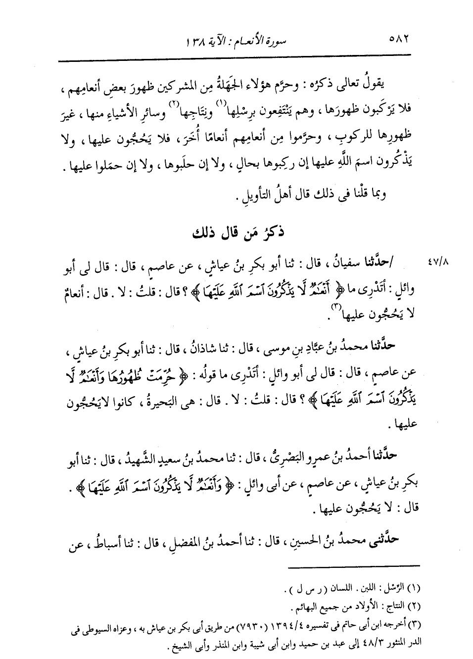 حَدَّثَنِي مُحَمَّدُ بْنُ الْحُسَيْنِ، قَالَ: ثنا أَحْمَدُ بْنُ الْمُفَضَّلِ، قَالَ: ثنا أَسْبَاطٌ، عَنِ -[583]- السُّدِّيِّ: أَمَّا: {§أَنْعَامٌ حُرِّمَتْ ظُهُورُهَا} [الأنعام: 138] فَهِيَ الْبَحِيرَةُ وَالسَّائِبَةُ وَالْحَامُ، وَأَمَّا الْأَنْعَامُ الَّتِي لَا يَذْكُرُونَ اسْمَ اللَّهِ عَلَيْهَا قَالَ: إِذَا وَلَّدُوهَا، وَلَا إِنْ نَحَرُوهَا "