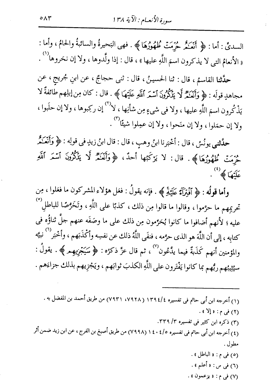 حَدَّثَنَا الْقَاسِمُ، قَالَ: ثنا الْحُسَيْنُ، قَالَ: ثني حَجَّاجٌ، عَنِ ابْنِ جُرَيْجٍ، عَنْ مُجَاهِدٍ، قَوْلُهُ: {وَأَنْعَامٌ لَا يَذْكُرُونَ اسْمَ اللَّهِ عَلَيْهَا} [الأنعام: 138] قَالَ: «§كَانَ مِنْ إِبِلِهِمْ طَائِفَةٌ لَا يَذْكُرُونَ اسْمَ اللَّهِ عَلَيْهَا وَلَا فِي شَيْءٍ مِنْ شَأْنِهَا، لَا إِنْ رَكِبُوهَا، وَلَا إِنْ حَلَبُوا، وَلَا إِنْ حَمَلُوا، وَلَا إِنْ مَنَحُوا، وَلَا إِنْ عَمِلُوا شَيْئًا»