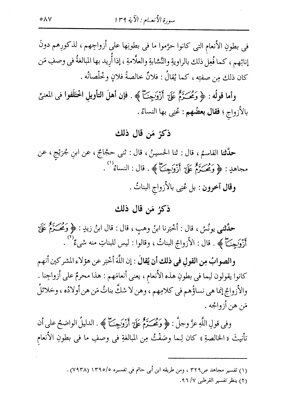 ذِكْرُ مَنْ قَالَ ذَلِكَ حَدَّثَنَا الْقَاسِمُ، قَالَ: ثنا الْحُسَيْنُ، قَالَ: ثني حَجَّاجٌ، عَنِ ابْنِ جُرَيْجٍ، عَنْ مُجَاهِدٍ: {§وَمُحَرَّمٌ عَلَى أَزْوَاجِنَا} [الأنعام: 139] قَالَ: «النِّسَاءُ» وَقَالَ آخَرُونَ: بَلْ عَنَى بِالْأَزْوَاجِ الْبَنَاتِ