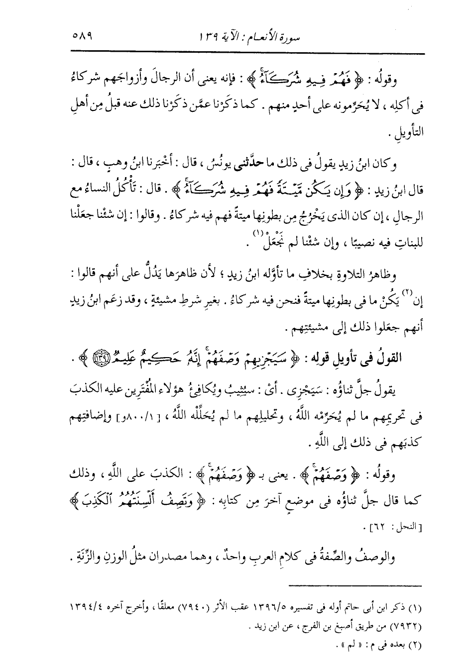 §الْقَوْلُ فِي تَأْوِيلِ قَوْلِهِ تَعَالَى: {سَيَجْزِيهِمْ وَصْفَهُمْ إِنَّهُ حَكِيمٌ عَلِيمٌ} [الأنعام: 139] يَقُولُ جَلَّ ثَنَاؤُهُ: سَيَجْزِي: أَيْ سَيُثِيبُ وَيُكَافِئُ هَؤُلَاءِ الْمُفْتَرِينَ عَلَيْهِ الْكَذِبَ فِي تَحْرِيمِهِمْ مَا لَمْ يُحَرِّمْهُ اللَّهُ، وَتَحْلِيلِهِمْ مَا لَمْ يُحَلِّلْهُ اللَّهُ، وَإِضَافَتِهِمْ كَذِبَهُمْ فِي ذَلِكَ إِلَى اللَّهِ. وَقَوْلُهُ: {وَصْفَهُمْ} [الأنعام: 139] يَعْنِي بِوَصْفِهِمُ الْكَذِبَ عَلَى اللَّهِ، وَذَلِكَ كَمَا قَالَ جَلَّ ثَنَاؤُهُ فِي مَوْضِعٍ آخَرَ مِنْ كِتَابِهِ: {وَتَصِفُ أَلْسِنَتُهُمُ الْكَذِبَ} [النحل: 62] ، وَالْوَصْفُ وَالصِّفَةُ فِي كَلَامِ الْعَرَبِ وَاحِدٌ، وَهُمَا مَصْدَرَانِ مِثْلُ الْوَزْنِ وَالزِّنَةِ. -[590]- وَبِنَحْوِ الَّذِي قُلْنَا فِي مَعْنَى (الْوَصْفِ) قَالَ أَهْلُ التَّأْوِيلِ