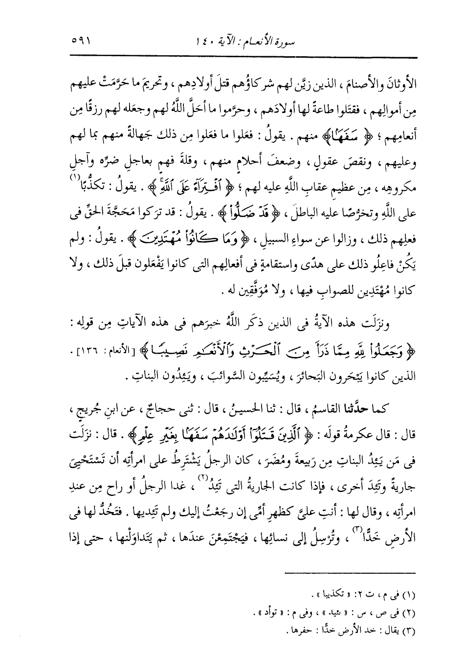 كَمَا حَدَّثَنَا الْقَاسِمُ، قَالَ: ثنا الْحُسَيْنُ، قَالَ: ثني حَجَّاجٌ، عَنِ ابْنِ جُرَيْجٍ، قَالَ: قَالَ عِكْرِمَةُ: قَوْلُهُ: {§الَّذِينَ قَتَلُوا أَوْلَادَهُمْ سَفَهًا بِغَيْرِ عِلْمٍ} [الأنعام: 140] قَالَ: " نَزَلَتْ فِيمَنْ يَئِدُ الْبَنَاتِ مِنْ رَبِيعَةَ وَمُضَرَ، كَانَ الرَّجُلُ يَشْتَرِطُ عَلَى امْرَأَتِهِ أَنْ تَسْتَحْيِي جَارِيَةً وَتَئِدَ أُخْرَى، فَإِذَا كَانَتِ الْجَارِيَةُ الَّتِي تُوأَدُ غَدَا الرَّجُلُ أَوْ رَاحَ مِنْ عِنْدِ امْرَأَتِهِ وَقَالَ لَهَا: أَنْتِ عَلَيَّ كَظَهْرِ أُمِّي إِنْ رَجَعْتُ إِلَيْكِ وَلَمْ تَئِدِيهَا، فَتَخُدُّ لَهَا فِي الْأَرْضِ خَدًّا، وَتُرْسِلُ إِلَى نِسَائِهَا فَيَجْتَمِعْنَ عِنْدَهَا، ثُمَّ يَتَدَاوَلْنَهَا، حَتَّى إِذَا -[592]- أَبْصَرَتْهُ رَاجِعًا دَسَّتْهَا فِي حُفْرَتِهَا، ثُمَّ سَوَّتْ عَلَيْهَا التُّرَابَ "