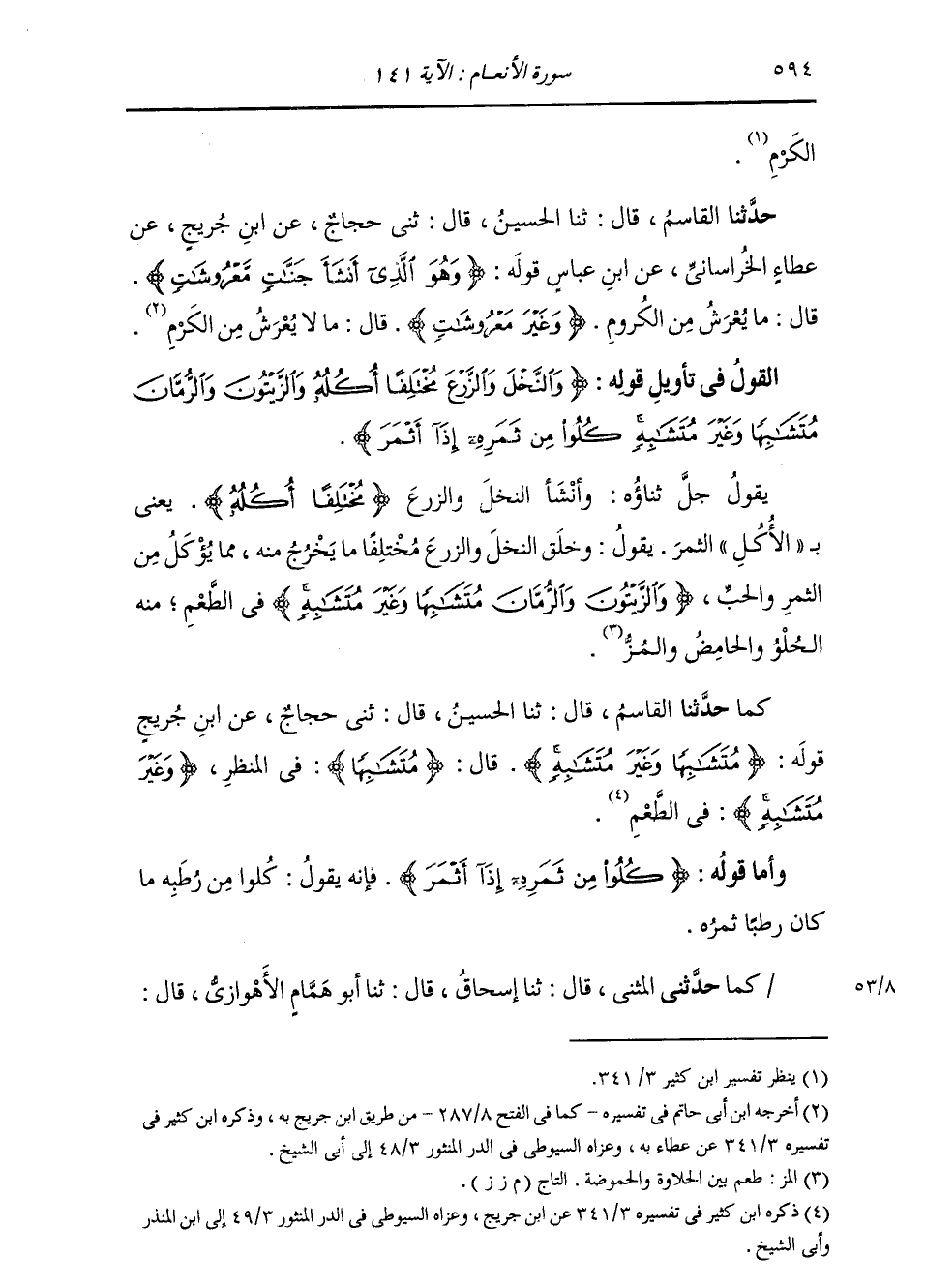 §الْقَوْلُ فِي تَأْوِيلِ قَوْلِهِ تَعَالَى: {وَالنَّخْلَ وَالزَّرْعَ مُخْتَلِفًا أُكُلُهُ وَالزَّيْتُونَ وَالرُّمَّانَ مُتَشَابِهًا وَغَيْرَ مُتَشَابِهِ كُلُوا مِنْ ثَمَرَهِ إِذا أَثْمَرَ} [الأنعام: 141] يَقُولُ جَلَّ ثَنَاؤُهُ: وَأَنْشَأَ النَّخْلَ وَالزَّرْعِ مُخْتَلِفًا أُكُلُهُ، يَعْنِي بِالْأُكُلِ: الثَّمَرَ، يَقُولُ: وَخَلَقَ النَّخْلَ وَالزَّرْعَ مُخْتَلِفًا مَا يَخْرُجُ مِنْهُ مِمَّا يُؤْكَلُ مِنَ الثَّمَرِ وَالْحَبِّ وَالزَّيْتُونِ وَالرُّمَّانِ، مُتَشَابِهًا وَغَيْرَ مُتَشَابِهٍ فِي الطَّعْمِ، مِنْهُ الْحُلْوُ وَالْحَامِضُ وَالْمُزُّ