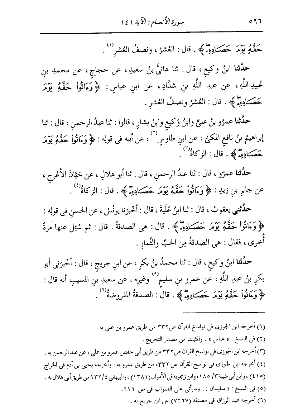 حَدَّثَنَا عَمْرُو بْنُ عَلِيٍّ، وَابْنُ وَكِيعٍ، وَابْنُ بَشَّارٍ، قَالُوا: ثنا عَبْدُ الرَّحْمَنِ، قَالَ: ثنا إِبْرَاهِيمُ بْنُ نَافِعٍ الْمَكِّيُّ، عَنِ ابْنِ طَاوُسٍ، عَنْ أبيه فِي قَوْلِهِ: {§وَآتُوا حَقَّهُ يَوْمَ حَصَادِهِ} [الأنعام: 141] قَالَ: «الزَّكَاةُ»