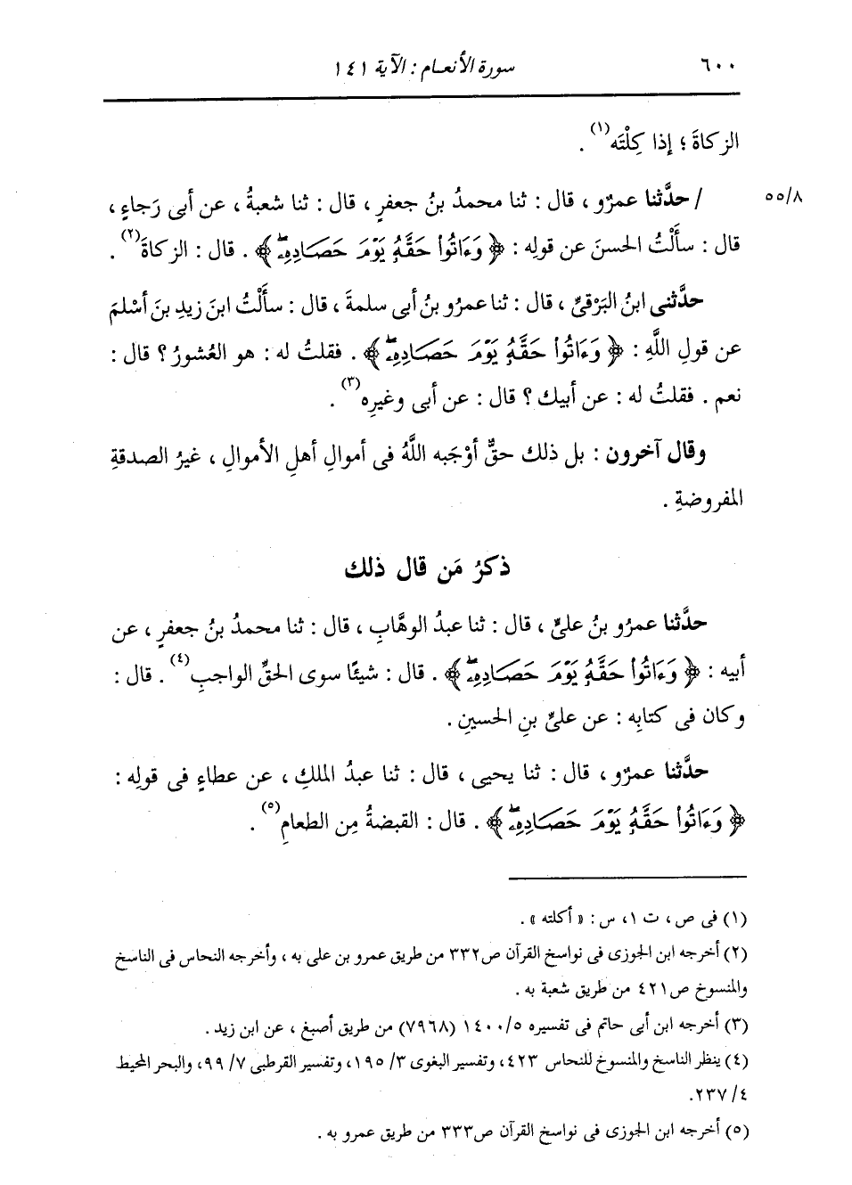 ذِكْرُ مَنْ قَالَ ذَلِكَ حَدَّثَنَا عَمْرُو بْنُ عَلِيٍّ، قَالَ: ثنا عَبْدُ الْوَهَّابِ قَالَ: ثنا مُحَمَّدُ بْنُ جَعْفَرٍ، عَنْ أَبِيهِ: {§وَآتُوا حَقَّهُ يَوْمَ حَصَادِهِ} [الأنعام: 141] قَالَ: " شَيْئًا سِوَى الْحَقِّ الْوَاجِبِ قَالَ: وَكَانَ فِي كِتَابِهِ: عَنْ عَلِيِّ بْنِ الْحُسَيْنِ