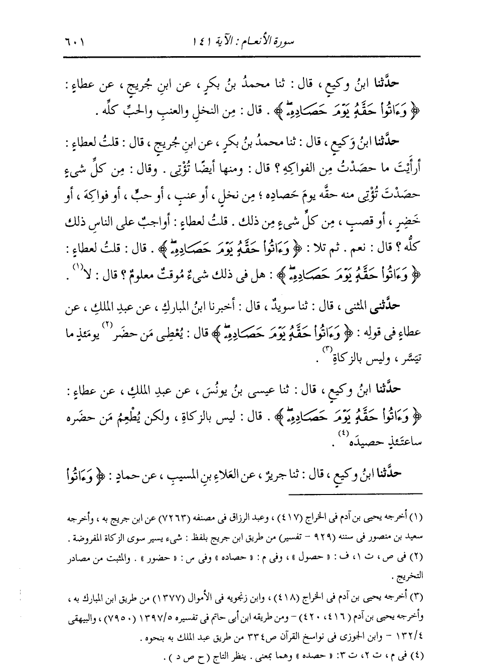 حَدَّثَنَا ابْنُ وَكِيعٍ، قَالَ: ثنا مُحَمَّدُ بْنُ بَكْرٍ، عَنِ ابْنِ جُرَيْجٍ، قَالَ: قُلْتُ لِعَطَاءٍ: " أَرَأَيْتَ مَا حَصَدْتُ مِنَ الْفَوَاكِهِ؟ قَالَ: وَمِنْهَا أَيْضًا تُؤْتِي، وَقَالَ: §مِنْ كُلِّ شَيْءٍ حَصَدْتَ تُؤْتِي مِنْهُ حَقَّهُ يَوْمَ حَصَادِهِ، مِنْ نَخْلٍ أَوْ عِنَبٍ أَوْ حَبٍّ أَوْ فَوَاكِهَ أَوْ خَضِرٍ أَوْ قَصَبٍ، مِنْ كُلِّ شَيْءٍ مِنْ ذَلِكَ. قُلْتُ لِعَطَاءٍ: أَوَاجِبٌ عَلَى النَّاسِ ذَلِكَ كُلُّهُ؟ قَالَ: نَعَمْ، ثُمَّ تَلَا: {وَآتُوا حَقَّهُ يَوْمَ حَصَادِهِ} [الأنعام: 141] ، قَالَ: قُلْتُ لِعَطَاءٍ: {وَآتَوْا حَقَّهُ يَوْمَ حَصَادِهِ} [الأنعام: 141] ، هَلْ فِي ذَلِكَ شَيْءٌ مُؤَقَّتٌ مَعْلُومٌ؟ قَالَ: لَا