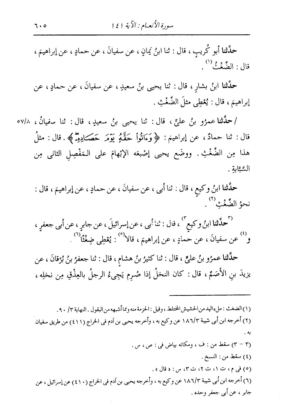 حَدَّثَنَا عَمْرُو بْنُ عَلِيٍّ، قَالَ: ثنا يَحْيَى بْنُ سَعِيدٍ، قَالَ: ثنا سُفْيَانُ، قَالَ: ثنا حَمَّادٌ، عَنْ إِبْرَاهِيمَ: {وَآتُوا حَقَّهُ يَوْمَ حَصَادِهِ} [الأنعام: 141] قَالَ: «§مِثْلُ هَذَا مِنَ الضِّغْثِ» وَوَضَعَ يَحْيَى إِصْبَعَهُ الْإِبْهَامَ عَلَى الْمِفْصَلِ الثَّانِي مِنَ السَّبَّابَةِ