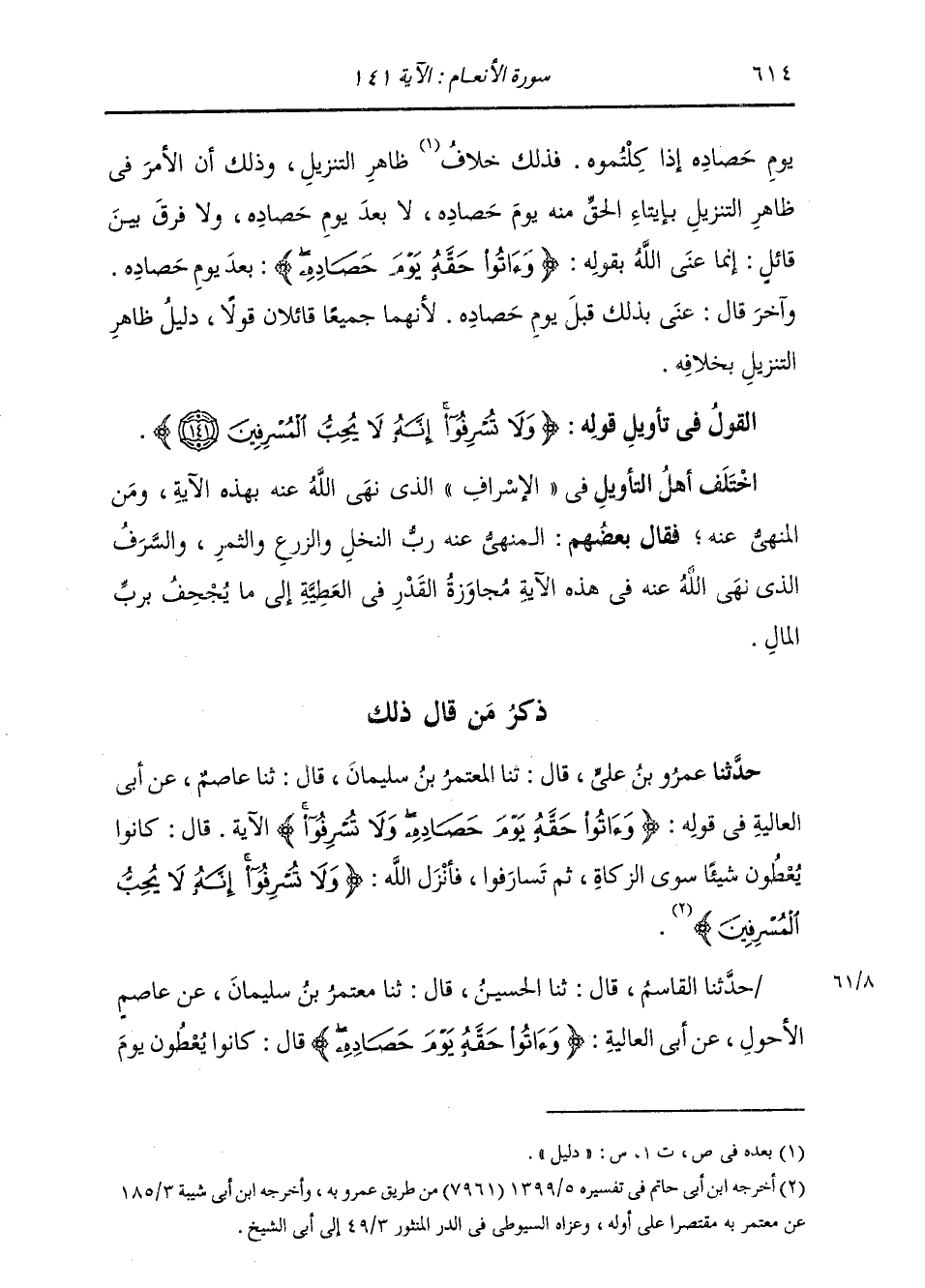 §الْقَوْلُ فِي تَأْوِيلِ قَوْلِهِ تَعَالَى: {وَلَا تُسْرِفُوا إِنَّهُ لَا يُحِبُّ الْمُسْرِفِينَ} [الأنعام: 141] اخْتَلَفَ أَهْلُ التَّأْوِيلِ فِي الْإِسْرَافِ الَّذِي نَهَى اللَّهُ عَنْهُ بِهَذِهِ الْآيَةِ، وَمَنِ الْمَنْهِيُّ عَنْهُ. فَقَالَ بَعْضُهُمُ: الْمَنْهِيُّ عَنْهُ: رَبُّ النَّخْلِ وَالزَّرْعِ وَالثَّمَرِ، وَالسَّرَفُ الَّذِي نَهَى اللَّهُ عَنْهُ فِي هَذِهِ الْآيَةِ، مُجَاوَزَةُ الْقَدْرِ فِي الْعَطِيَّةِ إِلَى مَا يُجْحِفُ بِرَبِّ الْمَالِ