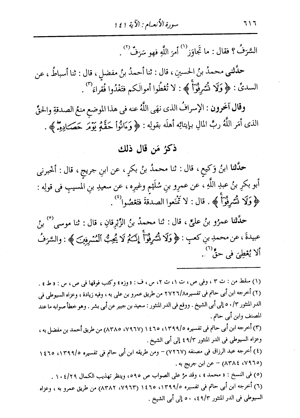 حَدَّثَنِي مُحَمَّدُ بْنُ الْحُسَيْنِ، قَالَ: ثنا أَحْمَدُ بْنُ مُفَضَّلٍ، قَالَ: ثنا أَسْبَاطٌ، عَنِ السُّدِّيِّ: {وَلَا تُسْرِفُوا} [الأنعام: 141] : «§لَا تُعْطُوا أَمْوَالَكُمْ فَتَغْدُوا فُقَرَاءَ» وَقَالَ آخَرُونَ: الْإِسْرَافُ الَّذِي نَهَى اللَّهُ عَنْهُ فِي هَذَا الْمَوْضِعِ: مَنْعُ الصَّدَقَةِ وَالْحَقِّ الَّذِي أَمَرَ اللَّهُ رَبَّ الْمَالِ بِإِيتَائِهِ أَهْلَهُ، بِقَوْلِهِ: {وَآتُوا حَقَّهُ يَوْمَ حَصَادِهِ} [الأنعام: 141]