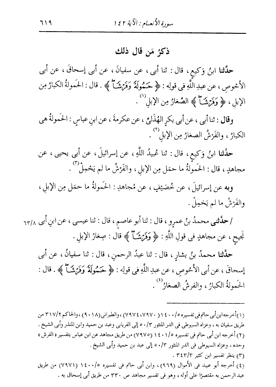 ذِكْرُ مَنْ قَالَ ذَلِكَ حَدَّثَنَا ابْنُ وَكِيعٍ، قَالَ: ثنا أَبِي، عَنْ سُفْيَانَ، عَنْ أَبِي إِسْحَاقَ، عَنْ أَبِي الْأَحْوَصِ، عَنْ عَبْدِ اللَّهِ، فِي قَوْلِهِ: {§حَمُولَةً وَفَرْشًا} [الأنعام: 142] قَالَ: " الْحَمُولَةُ: الْكِبَارُ مِنَ الْإِبِلِ، وَفَرْشًا: الصِّغَارُ مِنَ الْإِبِلِ "