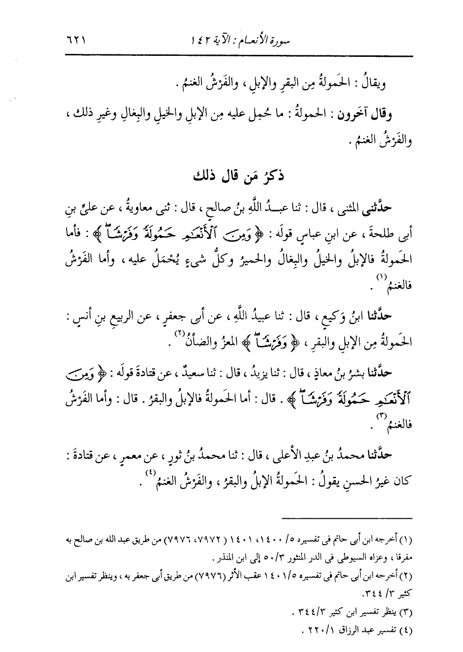 ذِكْرُ مَنْ قَالَ ذَلِكَ حَدَّثَنِي الْمُثَنَّى، قَالَ: ثنا عَبْدُ اللَّهِ بْنُ صَالِحٍ، قَالَ: ثني مُعَاوِيَةُ، عَنْ عَلِيِّ بْنِ أَبِي طَلْحَةَ، عَنِ ابْنِ عَبَّاسٍ، قَوْلُهُ: {وَمِنَ الْأَنْعَامِ حَمُولَةً وَفَرْشًا} [الأنعام: 142] : " §فَأَمَّا الْحَمُولَةُ: فَالْإِبِلُ وَالْخَيْلُ وَالْبِغَالُ وَالْحَمِيرُ، وَكُلُّ شَيْءٍ يُحْمَلُ عَلَيْهِ، وَأَمَّا الْفَرْشُ: فَالْغَنَمُ "