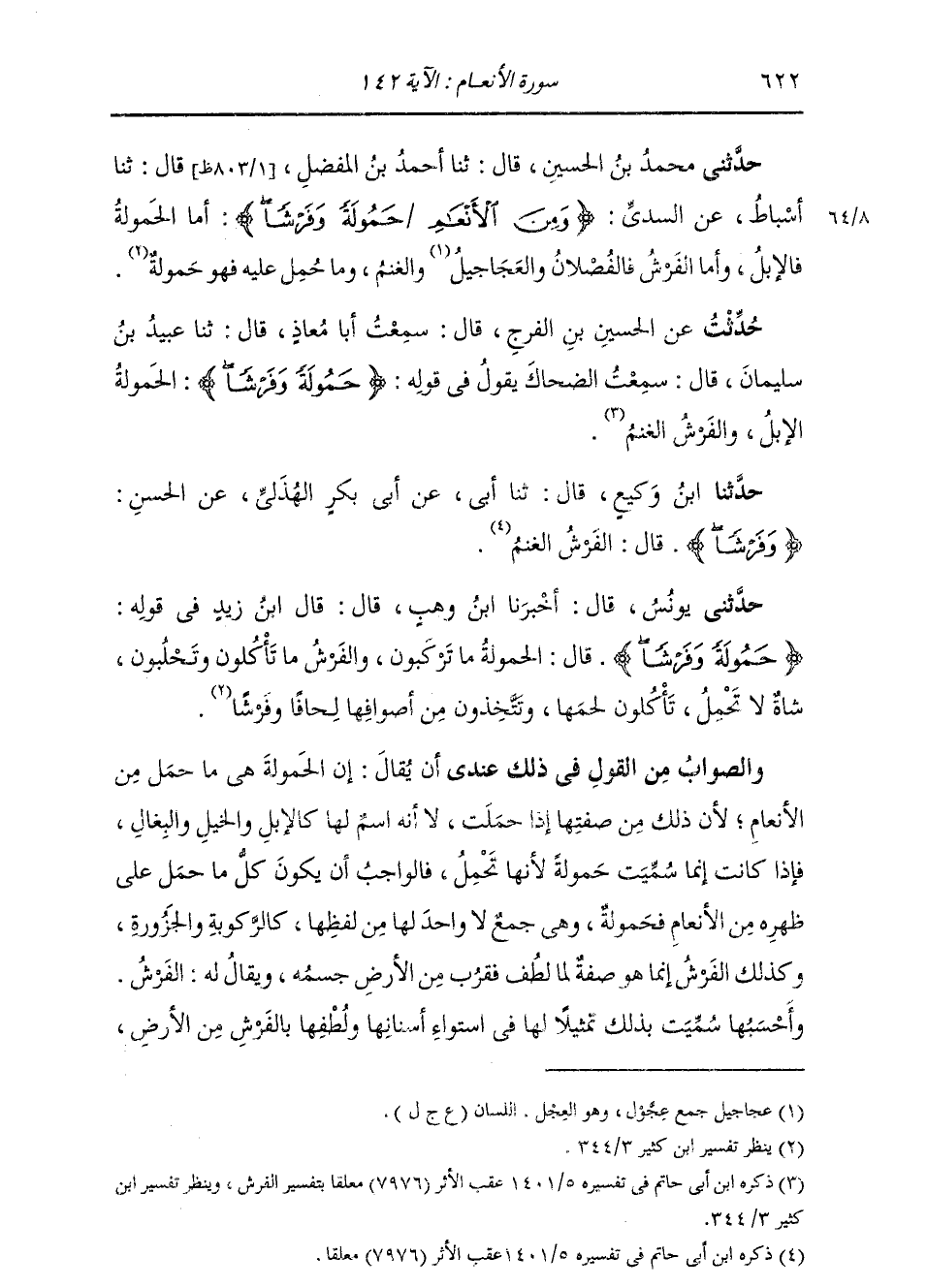 حَدَّثَنِي مُحَمَّدُ بْنُ الْحُسَيْنِ، قَالَ: ثنا أَحْمَدُ بْنُ الْمُفَضَّلِ، قَالَ: ثنا أَسْبَاطٌ، عَنِ السُّدِّيِّ: {§وَمِنَ الْأَنْعَامِ حَمُولَةً وَفَرْشًا} [الأنعام: 142] " أَمَّا الْحَمُولَةُ: فَالْإِبِلُ. وَأَمَّا الْفَرْشُ: فَالْفُصْلَانِ وَالْعَجَاجِيلُ وَالْغَنَمُ، وَمَا حُمِلَ عَلَيْهِ فَهُوَ حَمُولَةٌ "
