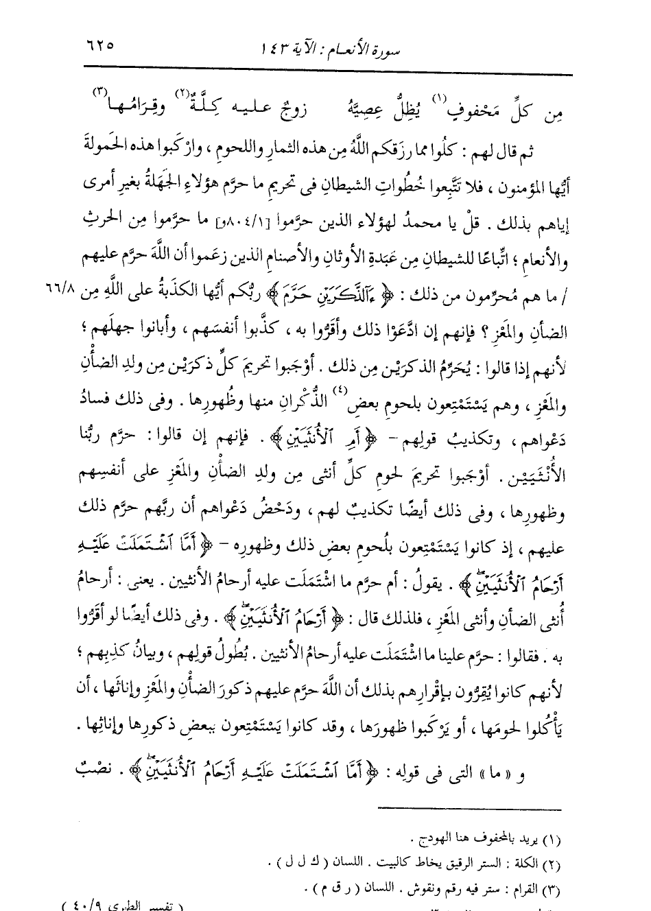 ثُمَّ قَالَ لَهُمْ: كُلُوا مِمَّا رَزَقَكُمُ اللَّهُ مِنْ هَذِهِ الثِّمَارِ وَاللُّحُومِ، وَارْكَبُوا هَذِهِ الْحَمُولَةَ أَيُّهَا الْمُؤْمِنُونَ، فَلَا تَتَّبِعُوا خُطُوَاتِ الشَّيْطَانِ فِي تَحْرِيمِ مَا حَرَّمَ هَؤُلَاءِ الْجَهَلَةُ بِغَيْرِ أَمْرِي إِيَّاهُمْ بِذَلِكَ. قُلْ يَا مُحَمَّدُ لِهَؤُلَاءِ الَّذِينَ حَرَّمُوا مَا حَرَّمُوا مِنَ الْحَرْثِ وَالْأَنْعَامِ، اتِّبَاعًا لِلشَّيْطَانِ مِنْ عَبَدَةِ الْأَوْثَانِ وَالْأَصْنَامِ الَّذِينَ زَعَمُوا أَنَّ اللَّهَ حَرَّمَ عَلَيْهِمْ مَا هُمْ مُحَرِّمُونَ مِنْ ذَلِكَ: {آلذَّكَرَيْنِ حَرَّمَ} [الأنعام: 143] رَبُّكُمْ أَيُّهَا الْكُذُبَةُ عَلَى اللَّهِ مِنَ الضَّأْنِ وَالْمَعْزِ، فَإِنَّهُمْ إِنِ ادَّعَوْا ذَلِكَ وَأَقَرُّوا بِهِ، كَذَّبُوا أَنْفُسَهُمْ وَأَبَانُوا جَهْلَهُمْ، لِأَنَّهُمْ إِذَا قَالُوا: يُحَرِّمُ الذَّكَرَيْنِ مِنْ ذَلِكَ، أَوْجَبُوا تَحْرِيمَ كُلِّ ذَكَرَيْنِ مِنْ وَلَدِ الضَّأْنِ وَالْمَعْزِ، وَهُمْ يَسْتَمْتِعُونَ بِلُحُومِ الذُّكْرَانِ مِنْهَا وَظُهُورِهَا، وَفِي ذَلِكَ فَسَادُ دَعْوَاهُمْ وَتَكْذِيبُ قَوْلِهِمْ. {أَمِ الْأُنْثَيَيْنِ} [الأنعام: 143] فَإِنَّهُمْ إِنْ قَالُوا: حَرَّمَ رَبُّنَا الْأُنْثَيَيْنِ، أَوْجَبُوا تَحْرِيمَ لُحُومِ كُلِّ أُنْثَى مِنْ وَلَدِ الضَّأْنِ وَالْمَعْزِ عَلَى أَنْفُسِهِمْ وَظُهُورِهَا، وَفِي ذَلِكَ أَيْضًا تَكْذِيبٌ لَهُمْ، وَدَحْضُ دَعْوَاهُمْ أَنَّ رَبَّهُمْ حَرَّمَ ذَلِكَ عَلَيْهِمْ، إِذْ كَانُوا يَسْتَمْتِعُونَ بِلُحُومِ بَعْضِ ذَلِكَ وَظُهُورِهِ. {أَمَّا اشْتَمَلَتْ عَلَيْهِ أَرْحَامُ الْأُنْثَيَيْنِ} [الأنعام: 143] يَقُولُ: أَمْ حَرَّمَ مَا اشْتَمَلَتْ عَلَيْهِ أَرْحَامُ الْأُنْثَيَيْنِ، يَعْنِي أَرْحَامَ أُنْثَى الضَّأْنِ وَأُنْثَى الْمَعْزِ، فَلِذَلِكَ قَالَ: {أَرْحَامُ الْأُنْثَيَيْنِ} [الأنعام: 143] . وَفِي ذَلِكَ أَيْضًا لَوْ أَقَرُّوا بِهِ فَقَالُوا: حَرَّمَ عَلَيْنَا مَا اشْتَمَلَتْ عَلَيْهِ أَرْحَامُ الْأُنْثَيَيْنِ، بُطُولُ قَوْلِهِمْ وَبَيَانُ كَذِبِهِمْ، لِأَنَّهُمْ كَانُوا يُقِرُّونَ بِإِقْرَارِهِمْ بِذَلِكَ أَنَّ اللَّهَ حَرَّمَ عَلَيْهِمْ ذُكُورَ الضَّأْنِ وَالْمَعْزِ وَإِنَاثَهَا أَنْ يَأْكُلُوا لُحُومَهَا أَوْ يَرْكَبُوا ظُهُورَهَا، وَقَدْ كَانُوا يَسْتَمْتِعُونَ بِبَعْضِ ذُكُورِهَا وَإِنَاثِهَا. وَ (مَا) الَّتِي فِي قَوْلِهِ: {أَمَّا اشْتَمَلَتْ عَلَيْهِ أَرْحَامُ الْأُنْثَيَيْنِ} [الأنعام: 143] نُصِبَ