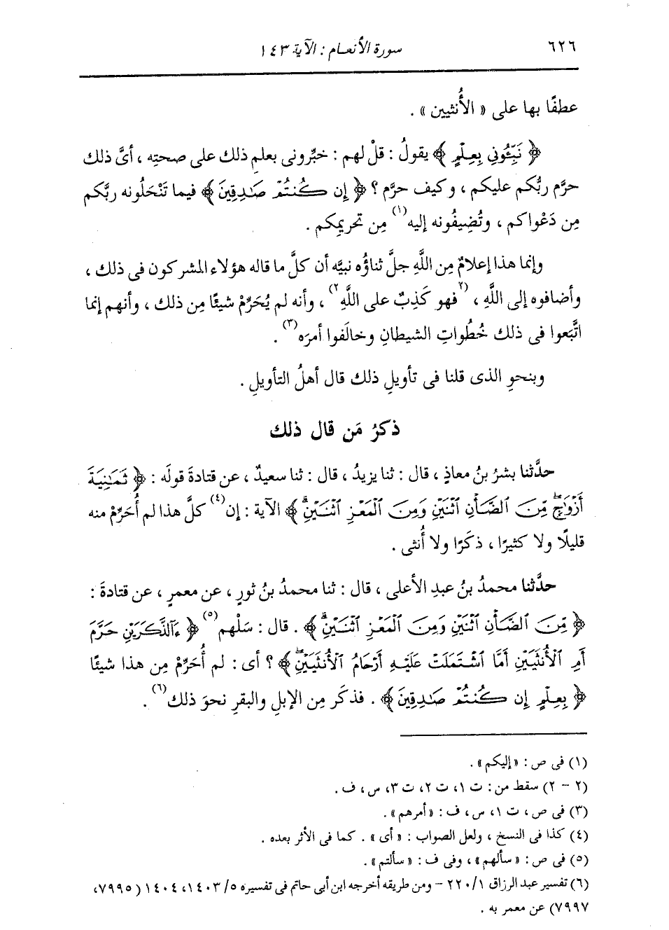 حَدَّثَنَا مُحَمَّدُ بْنُ عَبْدِ الْأَعْلَى، قَالَ: ثنا مُحَمَّدُ بْنُ ثَوْرٍ، عَنْ مَعْمَرٍ، عَنْ قَتَادَةَ: {§مِنَ الضَّأْنِ} [الأنعام: 143] اثْنَيْنِ وَمِنَ الْمَعْزِ اثْنَيْنِ قَالَ: سَلْهُمْ {آلذَّكَرَيْنِ حَرَّمَ أَمِ الْأُنْثَيَيْنِ أَمَّا اشْتَمَلَتْ عَلَيْهِ أَرْحَامُ الْأُنْثَيَيْنِ} [الأنعام: 143] ؟ أَيْ لَمْ أُحَرِّمْ مِنْ هَذَا شَيْئًا. {بِعِلْمٍ إِنْ كُنْتُمْ صَادِقِينَ} [الأنعام: 143] فَذَكَرَ مِنَ الْإِبِلِ وَالْبَقَرِ نَحْوَ ذَلِكَ "