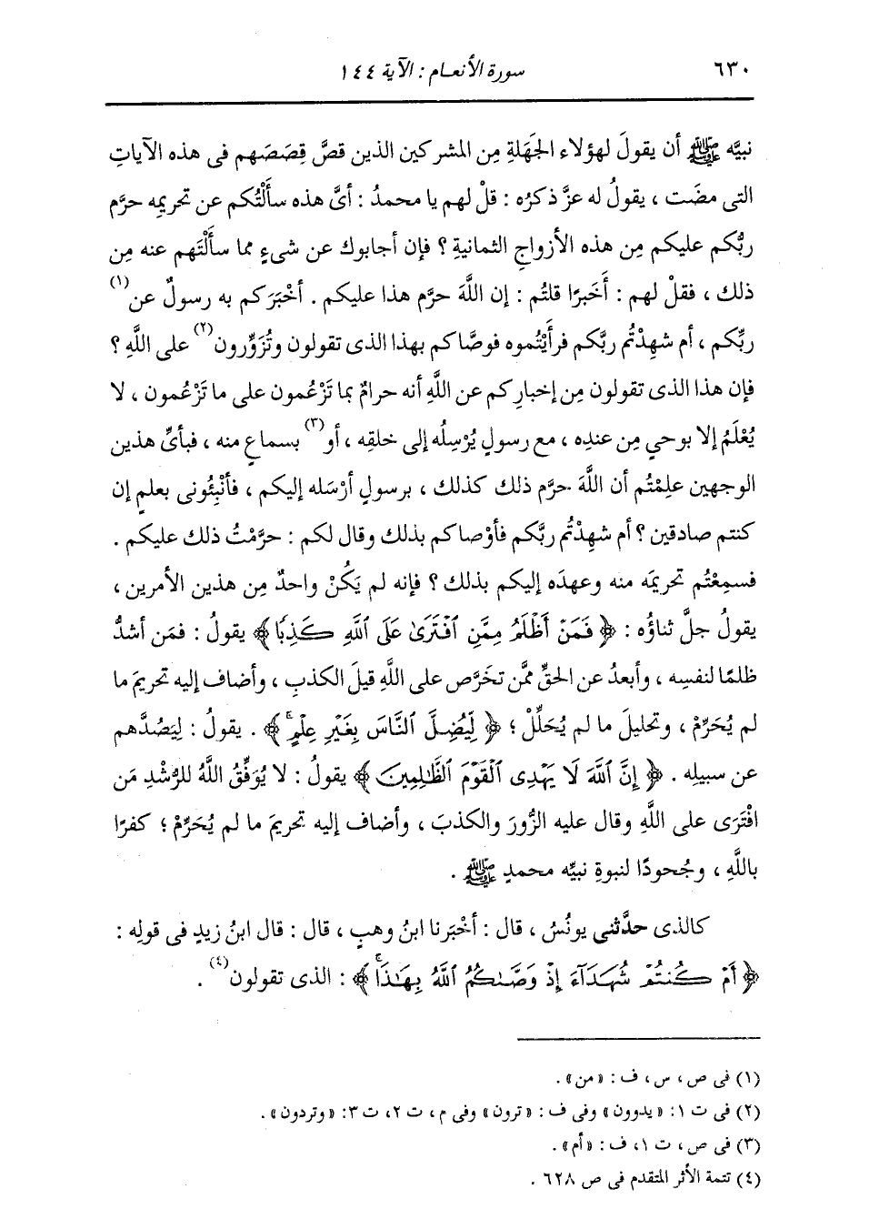 كَالَّذِي حَدَّثَنِي يُونُسُ، قَالَ: أَخْبَرَنَا ابْنُ وَهْبٍ، قَالَ: قَالَ ابْنُ زَيْدٍ، فِي قَوْلِهِ: {§أَمْ كُنْتُمْ شُهَدَاءَ إِذْ وَصَّاكُمُ اللَّهُ بِهَذَا} [الأنعام: 144] «الَّذِي تَقُولُونَ»