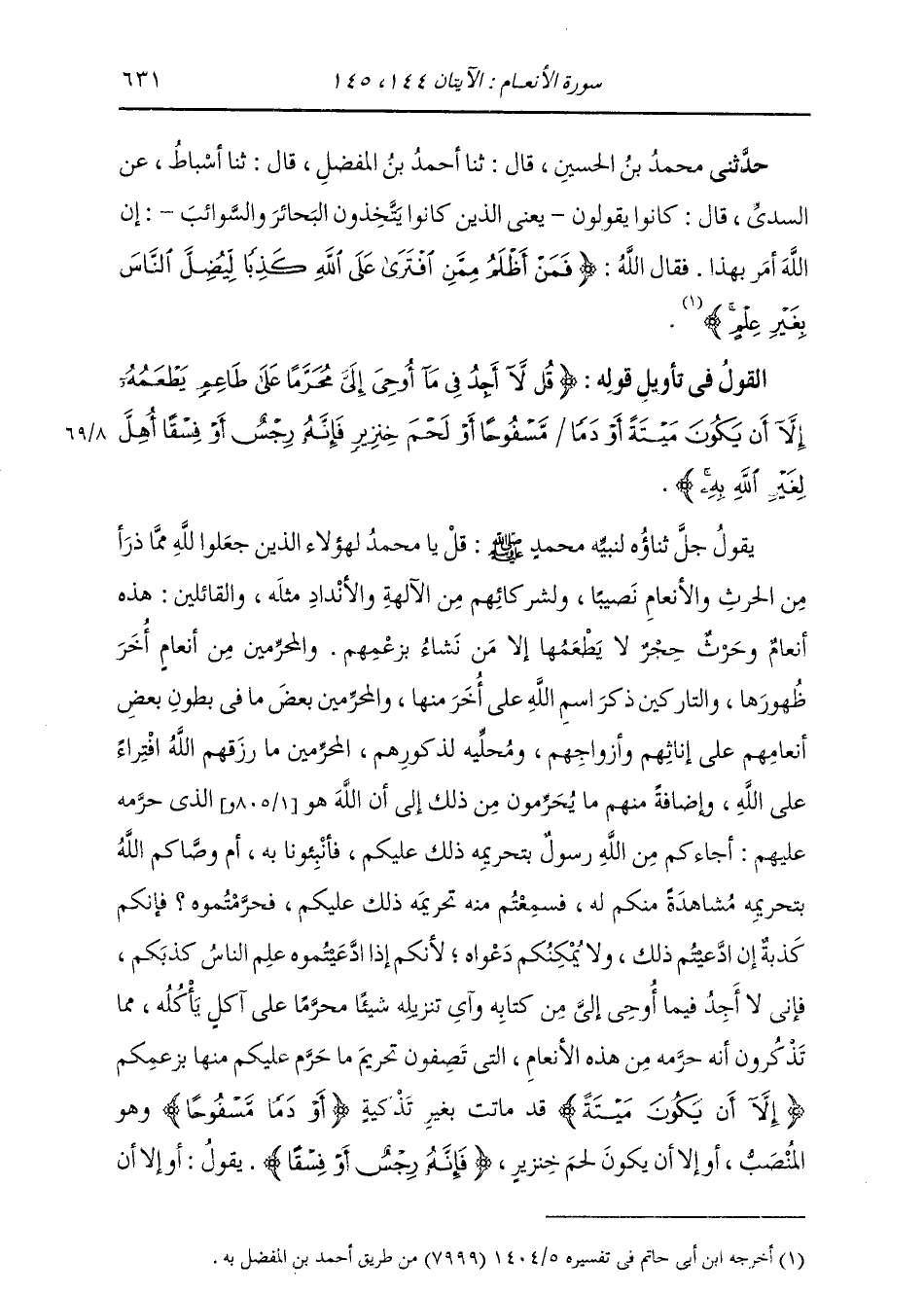 §الْقَوْلُ فِي تَأْوِيلِ قَوْلِهِ تَعَالَى: {قُلْ لَا أَجِدُ فِي مَا أُوحِيَ إِلَيَّ مُحَرَّمًا عَلَى طَاعِمٍ يَطْعَمُهُ إِلَّا أَنْ يَكُونَ مَيْتَةً أَوْ دَمًا مَسْفُوحًا أَوْ لَحْمَ خِنْزِيرٍ فَإِنَّهُ رِجْسٌ أَوْ فِسْقًا أُهِلَّ لِغَيْرِ اللَّهِ بِهِ فَمَنِ اضْطُرَّ غَيْرَ بَاغٍ وَلَا عَادٍ فَإِنَّ رَبَّكَ غَفُورٌ رَحِيمٌ} [الأنعام: 145] يَقُولُ جَلَّ ثَنَاؤُهُ لِنَبِيِّهِ مُحَمَّدٍ صَلَّى اللهُ عَلَيْهِ وَسَلَّمَ: قُلْ يَا مُحَمَّدُ لِهَؤُلَاءِ الَّذِينَ جَعَلُوا لِلَّهِ مِمَّا ذَرَأَ مِنَ الْحَرْثِ وَالْأَنْعَامِ نَصِيبًا، ولِشُرَكَائِهِمْ مِنَ الْآلِهَةِ وَالْأَنْدَادِ مِثْلَهُ، وَالْقَائِلِينَ {هَذِهِ أَنْعَامٌ وَحَرْثٌ حِجْرٌ لَا يَطْعَمُهَا إِلَّا مَنْ نَشَاءُ بِزَعْمِهِمْ} [الأنعام: 138] ، وَالْمُحَرِّمِينَ مِنْ أَنْعَامٍ أُخَرَ ظُهُورَهَا، وَالتَّارِكِينَ ذِكْرَ اسْمِ اللَّهِ عَلَى أُخَرَ مِنْهَا، وَالْمُحَرِّمِينَ بَعْضَ مَا فِي بُطُونِ بَعْضِ أَنْعَامِهِمْ عَلَى إِنَاثِهِمْ وَأَزْوَاجِهِمْ وَمُحِلِّيهِ لِذُكُورِهِمْ، الْمُحَرِّمِينَ مَا رَزَقَهُمُ اللَّهُ افْتِرَاءً عَلَى اللَّهِ، وَإِضَافَةً مِنْهُمْ مَا يُحَرِّمُونَ مِنْ ذَلِكَ إِلَى أَنَّ اللَّهَ هُوَ الَّذِي حَرَّمَهُ عَلَيْهِمْ: أَجَاءَكُمْ مِنَ اللَّهِ رَسُولٌ بِتَحْرِيمِهِ ذَلِكَ عَلَيْكُمْ، فَأَنْبِئُونَا بِهِ، أَمْ وَصَّاكُمُ اللَّهُ بِتَحْرِيمِهِ مُشَاهَدَةً مِنْكُمْ لَهُ، فَسَمِعْتُمْ مِنْهُ تَحْرِيمَهُ ذَلِكَ عَلَيْكُمْ فَحَرَّمْتُمُوهُ؟ فَإِنَّكُمْ كُذُبَةٌ إِنِ ادَّعَيْتُمْ ذَلِكَ وَلَا يُمْكِنُكُمْ دَعْوَاهُ، لِأَنَّكُمْ إِذَا ادَّعَيْتُمُوهُ عَلِمَ النَّاسُ كَذِبَكُمْ، فَإِنِّي لَا أَجِدُ فِيمَا أُوحِيَ إِلَيَّ مِنْ كِتَابِهِ وآيِ تَنْزِيلِهِ شَيْئًا مُحَرَّمًا عَلَى آكِلٍ يَأْكُلُهُ مِمَّا تَذْكُرُونَ أَنَّهُ حَرَّمَهُ مِنْ هَذِهِ الْأَنْعَامِ الَّتِي تَصِفُونَ، تَحْرِيمَ مَا حُرِّمَ عَلَيْكُمْ مِنْهَا بِزَعْمِكُمْ، إِلَّا أَنْ يَكُونَ مَيْتَةً قَدْ مَاتَتْ بِغَيْرِ تَذْكِيَةٍ أَوْ دَمًا مَسْفُوحًا وَهُوَ الْمُنْصَبُّ أَوْ إِلَّا أَنْ يَكُونَ لَحْمَ خِنْزِيرٍ. {فَإِنَّهُ رِجْسٌ أَوْ فِسْقًا} [الأنعام: 145] يَقُولُ: أَوْ إِلَّا أَنْ