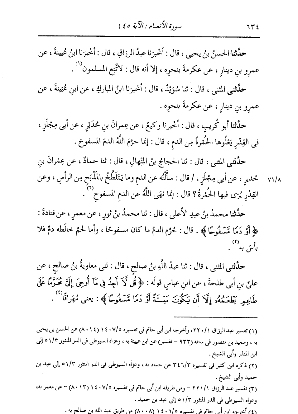 حَدَّثَنِي الْمُثَنَّى، قَالَ: ثنا عَبْدُ اللَّهِ بْنُ صَالِحٍ، قَالَ: ثني مُعَاوِيَةُ بْنُ صَالِحٍ، عَنْ عَلِيِّ بْنِ أَبِي طَلْحَةَ، عَنِ ابْنِ عَبَّاسٍ، قَوْلُهُ: {§قُلْ لَا أَجِدُ فِي مَا أُوحِيَ إِلَيَّ مُحَرَّمًا عَلَى طَاعِمٍ يَطْعَمُهُ إِلَّا أَنْ يَكُونَ مَيْتَةً أَوْ دَمًا مَسْفُوحًا} [الأنعام: 145] : «يَعْنِي مُهْرَاقًا»