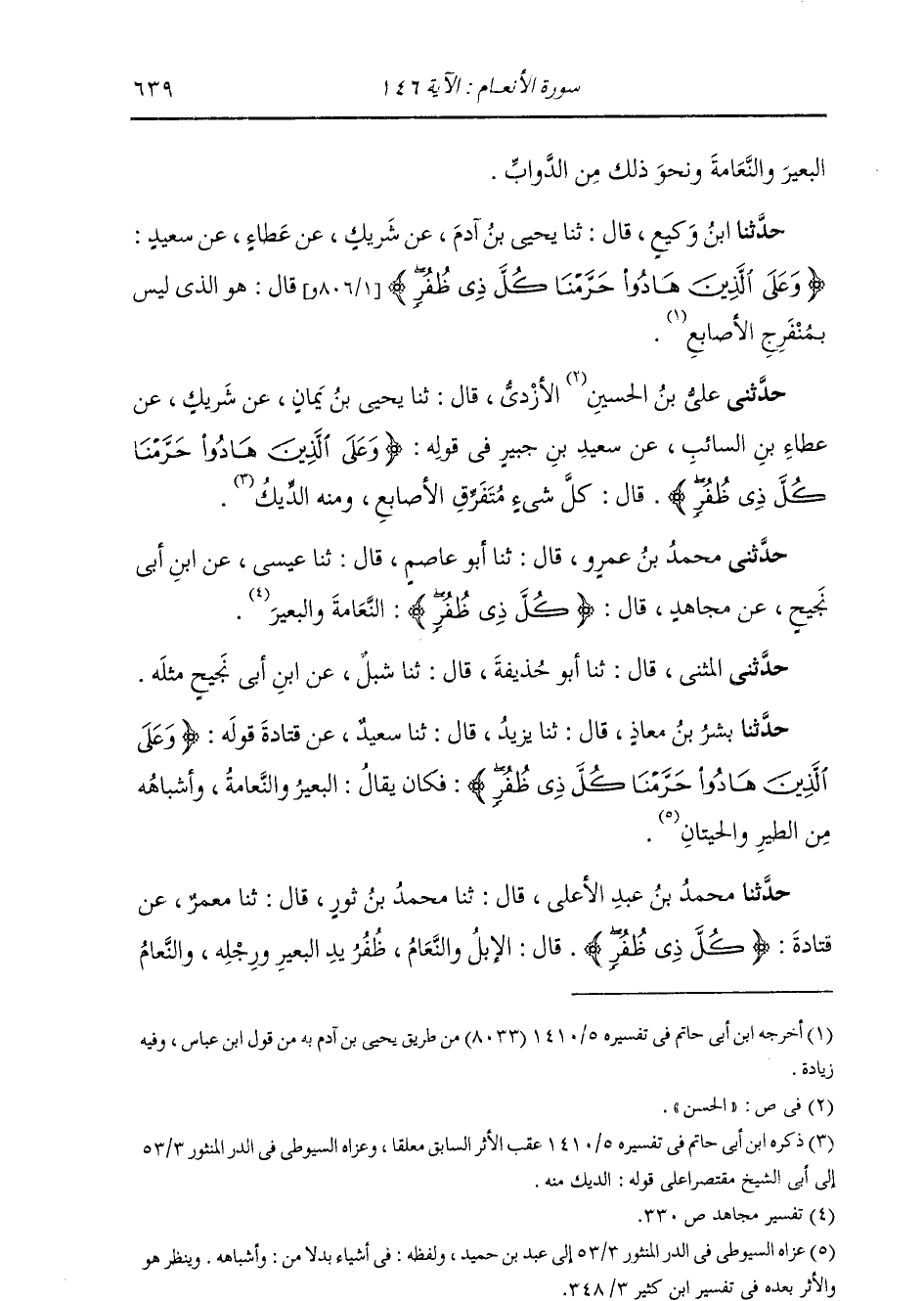 حَدَّثَنِي مُحَمَّدُ بْنُ عَمْرٍو، قَالَ: ثنا أَبُو عَاصِمٍ، قَالَ: ثنا عِيسَى، عَنِ ابْنِ أَبِي نَجِيحٍ، عَنْ مُجَاهِدٍ، قَالَ: {§كُلَّ ذِي ظُفُرٍ} [الأنعام: 146] : «النَّعَامَةُ وَالْبَعِيرُ» حَدَّثَنِي الْمُثَنَّى، قَالَ: ثنا أَبُو حُذَيْفَةَ، قَالَ: ثنا شِبْلٌ، عَنِ ابْنِ أَبِي نَجِيحٍ، مِثْلَهُ