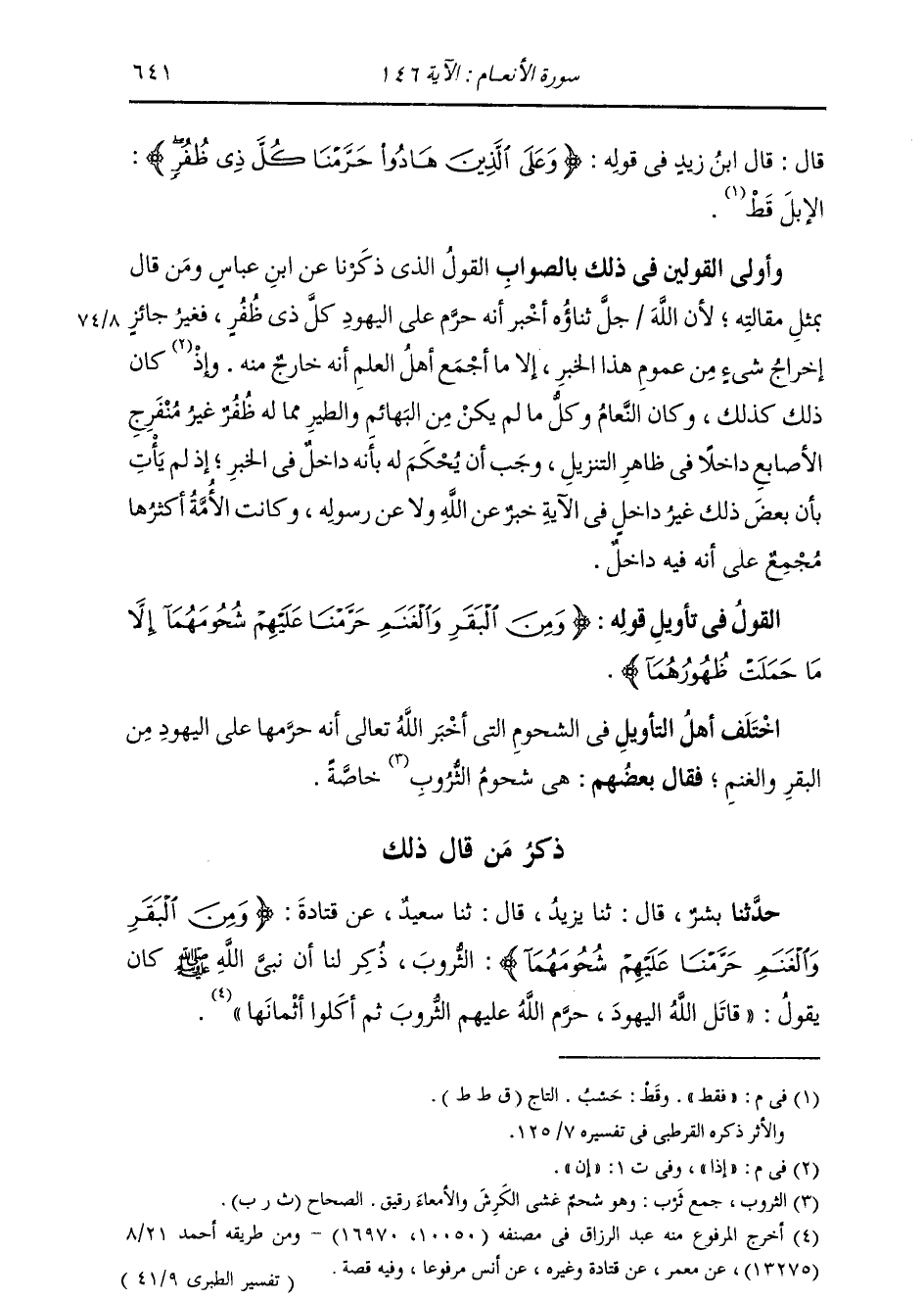 §الْقَوْلُ فِي تَأْوِيلِ قَوْلِهِ تَعَالَى: {وَمِنَ الْبَقَرِ وَالْغَنَمِ حَرَّمْنَا عَلَيْهِمْ شُحُومَهُمَا إِلَّا مَا حَمَلَتْ ظُهُورُهُمَا} [الأنعام: 146] اخْتَلَفَ أَهْلُ التَّأْوِيلِ فِي الشُّحُومِ الَّتِي أَخْبَرَ اللَّهُ تَعَالَى أَنَّهُ حَرَّمَهَا عَلَى الْيَهُودِ مِنَ الْبَقَرِ وَالْغَنَمِ، فَقَالَ بَعْضُهُمْ: هِيَ شُحُومُ الثُّرُوبُ خَاصَّةً