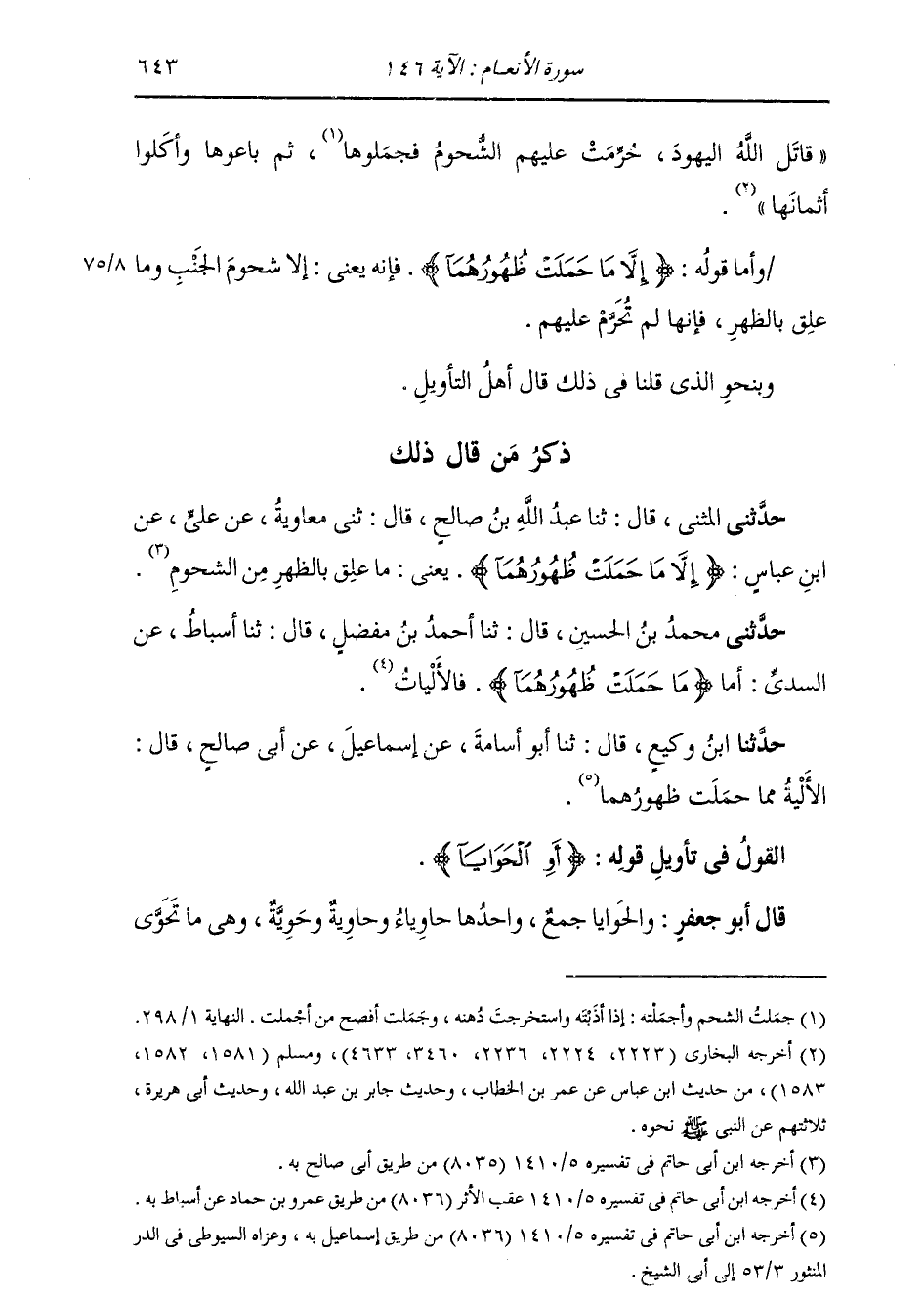 ذِكْرُ مَنْ قَالَ ذَلِكَ حَدَّثَنِي الْمُثَنَّى، قَالَ: ثنا عَبْدُ اللَّهِ بْنُ صَالِحٍ، قَالَ: ثني مُعَاوِيَةُ، عَنْ عَلِيٍّ، عَنِ ابْنِ عَبَّاسٍ: {إِلَّا مَا حَمَلَتْ ظُهُورُهُمَا} [الأنعام: 146] يَعْنِي: «§مَا عَلِقَ بِالظَّهْرِ مِنَ الشُّحُومِ»