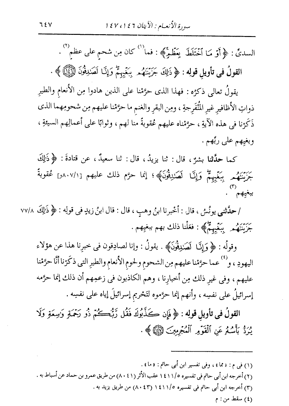 كَمَا حَدَّثَنَا بِشْرٌ، قَالَ: ثنا يَزِيدُ، قَالَ: ثنا سَعِيدٌ، عَنْ قَتَادَةَ: {§ذَلِكَ جَزَيْنَاهُمْ بِبَغْيهِمْ وَإِنَّا لَصَادِقُونَ} [الأنعام: 146] «إِنَّمَا حَرَّمَ ذَلِكَ عَلَيْهِمْ عُقُوبَةً بِبَغْيهِمْ»
