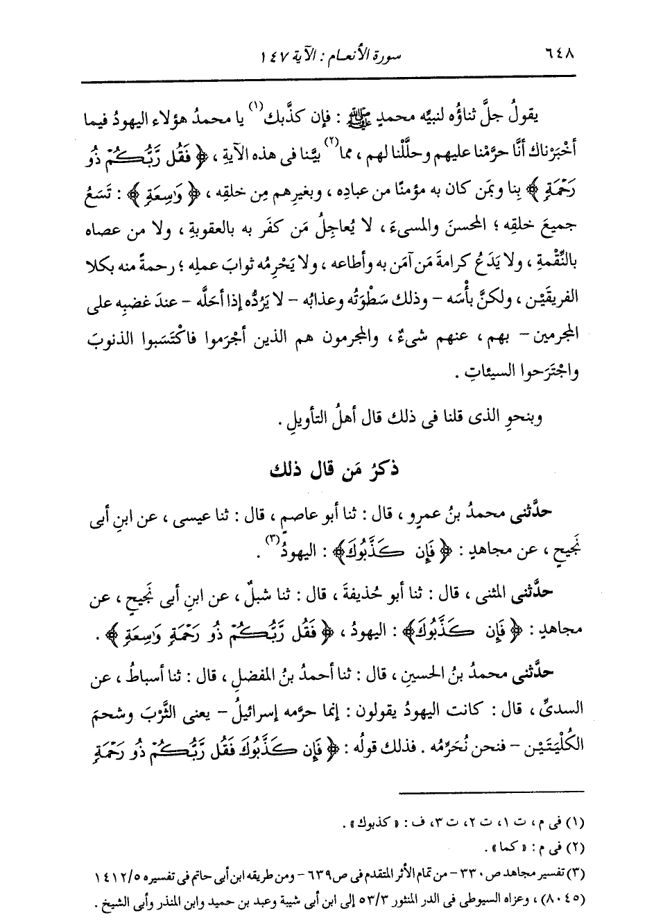 حَدَّثَنِي الْمُثَنَّى، قَالَ: ثنا أَبُو حُذَيْفَةَ، قَالَ: ثنا شِبْلٌ، عَنِ ابْنِ أَبِي نَجِيحٍ، عَنْ مُجَاهِدٍ: {§فَإِنْ كَذَّبُوكَ} [آل عمران: 184] : «الْيَهُودُ» {فَقُلْ رَبُّكُمْ ذُو رَحْمَةٍ وَاسِعَةٍ} [الأنعام: 147] "