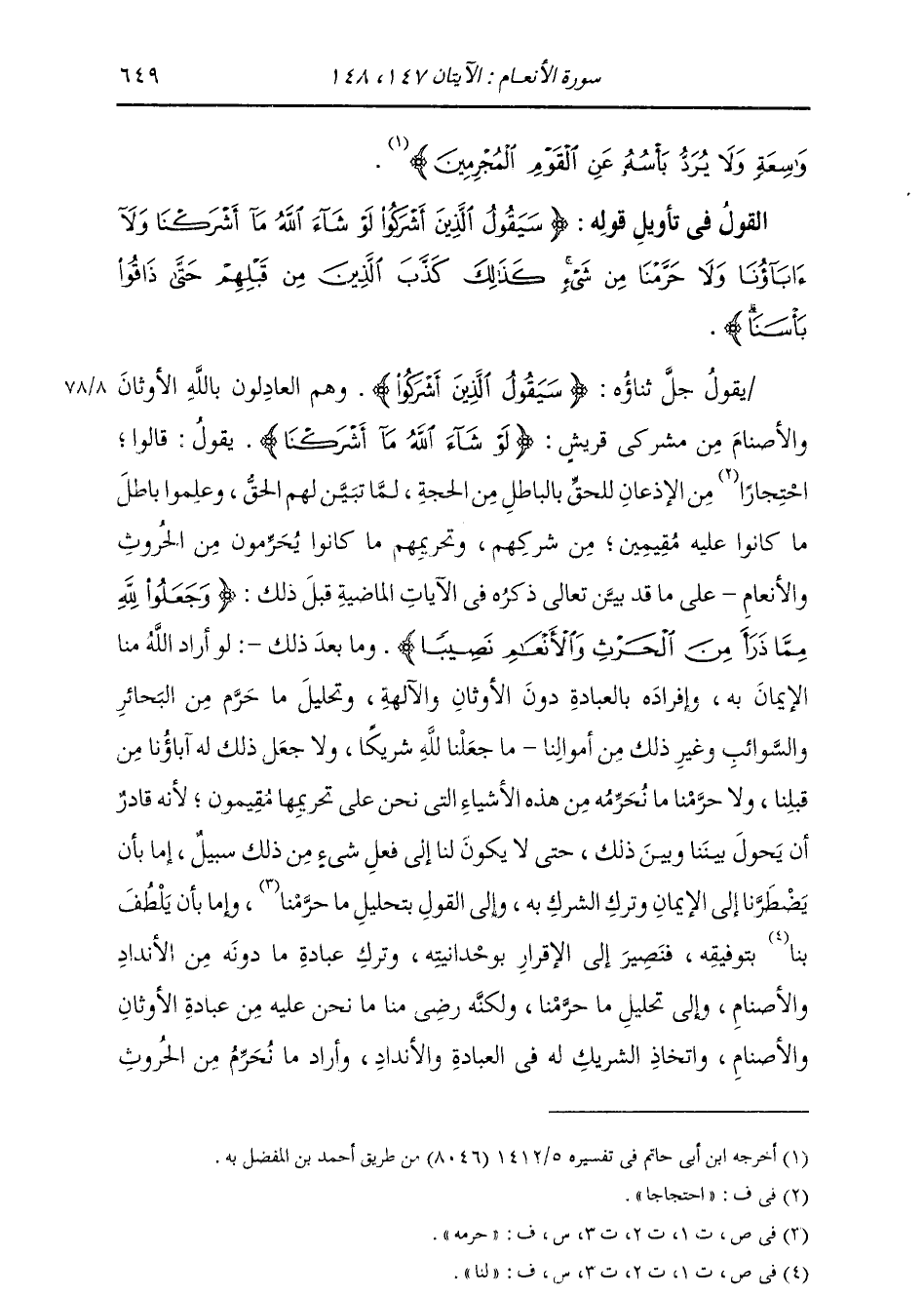 §الْقَوْلُ فِي تَأْوِيلِ قَوْلِهِ تَعَالَى: {سَيَقُولُ الَّذِينَ أَشْرَكُوا لَوْ شَاءَ اللَّهُ مَا أَشْرَكْنَا وَلَا آبَاؤُنَا وَلَا حَرَّمْنَا مِنْ شَيْءٍ كَذَلِكَ كَذَّبَ الَّذِينَ مِنْ قَبْلِهِمْ حَتَّى ذَاقُوا بَأْسَنَا قُلْ هَلْ عِنْدَكُمْ مِنْ عِلْمٍ فَتُخْرِجُوهُ لَنَا إِنْ تَتَّبِعُونَ إِلَّا الظَّنَّ وَإِنْ أَنْتُمْ إَلَّا تَخْرُصُونَ} [الأنعام: 148] يَقُولُ جَلَّ ثَنَاؤُهُ: {سَيَقُولُ الَّذِينَ أَشْرَكُوا} [الأنعام: 148] وَهُمُ الْعَادِلُونَ بِاللَّهِ الْأَوْثَانَ وَالْأَصْنَامَ مِنْ مُشْرِكِي قُرَيْشٍ: {لَوْ شَاءَ اللَّهُ مَا أَشْرَكْنَا} [الأنعام: 148] يَقُولُ: قَالُوا احْتِجَازًا مِنَ الْإِذْعَانِ لِلْحَقِّ بِالْبَاطِلِ مِنَ الْحُجَّةِ لَمَّا تَبَيَّنَ لَهُمُ الْحَقُّ، وَعَلِمُوا بَاطِلَ مَا كَانُوا عَلَيْهِ مُقِيمِينَ مِنْ شِرْكِهِمْ وَتَحْرِيمِهِمْ مَا كَانُوا يُحَرِّمُونَ مِنَ الْحُرُوثِ وَالْأَنْعَامِ، عَلَى مَا قَدْ بَيَّنَ تَعَالَى ذِكْرُهُ فِي الْآيَاتِ الْمَاضِيَةِ قَبْلَ ذَلِكَ: {وَجَعَلُوا لِلَّهِ مِمَّا ذَرَأَ مِنَ الْحَرْثِ وَالْأَنْعَامِ نَصِيبًا} [الأنعام: 136] وَمَا بَعْدَ ذَلِكَ: لَوْ أَرَادَ اللَّهُ مِنَّا الْإِيمَانَ بِهِ وَإِفْرَادَهُ بِالْعِبَادَةِ دُونَ الْأَوْثَانِ وَالْآلِهَةِ وَتَحْلِيلِ مَا حَرَّمَ مِنَ الْبَحَائِرِ وَالسَّوَائِبِ وَغَيْرِ ذَلِكَ مِنْ أَمْوَالِنَا، مَا جَعَلْنَا لِلَّهِ شَرِيكًا، وَلَا جَعَلَ ذَلِكَ لَهُ آبَاؤُنَا مِنْ قَبْلِنَا، وَلَا حَرَّمْنَا مَا نُحَرِّمُهُ مِنْ هَذِهِ الْأَشْيَاءِ الَّتِي نَحْنُ عَلَى تَحْرِيمِهَا مُقِيمُونَ، لِأَنَّهُ قَادِرٌ عَلَى أَنْ يَحُولَ بَيْنَنَا وَبَيْنَ ذَلِكَ، حَتَّى لَا يَكُونَ لَنَا إِلَى فِعْلِ شَيْءٍ مِنْ ذَلِكَ سَبِيلٌ، إِمَّا بِأَنْ يَضْطَرَّنَا إِلَى الْإِيمَانِ وَتَرْكِ الشِّرْكِ بِهِ وَإِلَى الْقَوْلِ بِتَحْلِيلِ مَا حَرَّمْنَا، وَإِمَّا بِأَنْ يَلْطُفَ بِنَا بِتَوْفِيقِهِ فَنَصِيرَ إِلَى الْإِقْرَارِ بِوَحْدَانِيَّتِهِ وَتَرْكِ عِبَادَةِ مَا دُونَهُ مِنَ الْأَنْدَادِ وَالْأَصْنَامِ، وَإِلَى تَحْلِيلِ مَا حَرَّمْنَا، وَلَكِنَّهُ رَضِيَ مِنَّا مَا نَحْنُ عَلَيْهِ مِنْ عِبَادَةَ الْأَوْثَانِ وَالْأَصْنَامِ، وَاتِّخَاذِ الشَّرِيكِ لَهُ فِي الْعِبَادَةِ وَالْأَنْدَادِ، وَأَرَادَ مَا نُحَرِّمُ مِنَ الْحُرُوثِ