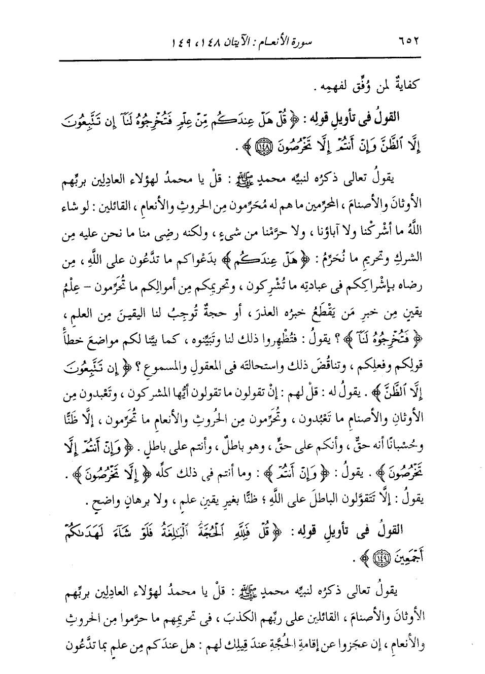 §الْقَوْلُ فِي تَأْوِيلِ قَوْلِهِ تَعَالَى: {قُلْ فَلِلَّهِ الْحُجَّةُ الْبَالِغَةُ فَلَوْ شَاءَ لَهَدَاكُمْ أَجْمَعِينَ} [الأنعام: 149] يَقُولُ تَعَالَى ذِكْرُهُ لِنَبِيِّهِ مُحَمَّدٍ صَلَّى اللهُ عَلَيْهِ وَسَلَّمَ: قُلْ يَا مُحَمَّدُ لِهَؤُلَاءِ الْعَادِلِينَ بِرَبِّهِمُ الْأَوْثَانَ وَالْأَصْنَامَ، الْقَائِلِينَ عَلَى رَبِّهِمُ الْكَذِبَ فِي تَحْرِيمِهِمْ مَا حَرَّمُوا مِنَ الْحُرُوثِ وَالْأَنْعَامِ، إِنْ عَجَزُوا عَنْ إِقَامَةِ الْحُجَّةِ عِنْدَ قِيلِكَ لَهُمْ: هَلْ عِنْدَكُمْ مِنْ عِلْمٍ بِمَا تَدَّعُونَ