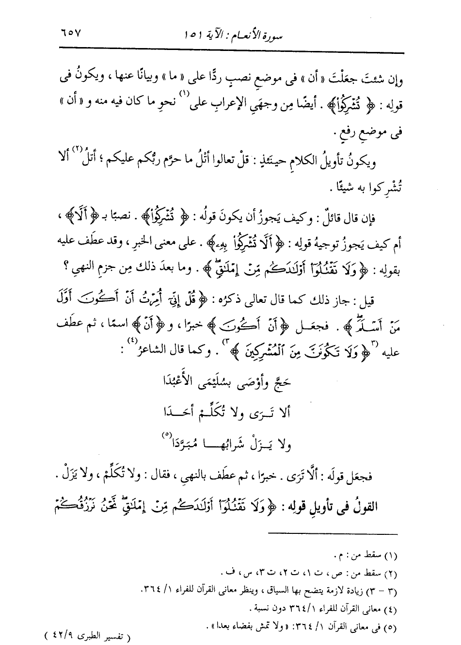 وَإِنْ شِئْتَ جَعَلْتَ (أَنْ) فِي مَوْضِعِ نَصْبٍ رَدًّا عَلَى (مَا) وَبَيَانًا عَنْهَا، وَيَكُونُ فِي قَوْلِهِ: {تُشْرِكُوا} [النساء: 36] أَيْضًا مِنْ وَجْهَيِ الْإِعْرَابِ نَحْوُ مَا كَانَ فِيهِ مِنْهُ، وَ (أَنْ) فِي مَوْضِعِ رَفْعٍ، وَيَكُونُ تَأْوِيلُ الْكَلَامِ حِينَئِذٍ: قُلْ تَعَالَوْا أَتْلُ مَا حَرَّمَ رَبُّكُمْ عَلَيْكُمْ، أَتْلُ أَنْ لَا تُشْرِكُوا بِهِ شَيْئًا. فَإِنْ قَالَ قَائِلٌ: وَكَيْفَ يَجُوزُ أَنْ يَكُونَ قَوْلُهُ: {تُشْرِكُوا} [النساء: 36] نَصْبًا بِـ (أَنْ لَا) ، أَمْ كَيْفَ يَجُوزُ تَوْجِيهُ قَوْلِهِ: (أَلَّا تُشْرِكُوا بِهِ) عَلَى مَعْنَى الْخَبَرِ وَقَدْ عَطَفَ عَلَيْهِ بِقَوْلِهِ: {وَلَا تَقْتُلُوا أَوْلَادَكُمْ مِنْ إِمْلَاقٍ} [الأنعام: 151] وَمَا بَعْدَ ذَلِكَ مِنْ جَزْمِ النَّهْيِ؟ قِيلَ: جَازَ ذَلِكَ كَمَا قَالَ تَعَالَى ذِكْرُهُ: {قُلْ إِنِّي أُمِرْتُ أَنْ أَكُونَ أَوَّلَ مَنْ أَسْلَمَ} [الأنعام: 14] فَجَعَلَ (أَنْ أَكُونَ) خَبَرًا وَ (أَنْ) اسْمًا، ثُمَّ عَطَفَ عَلَيْهِ (وَلَا تَكُونَنَّ مِنَ الْمُشْرِكِينَ) ، وَكَمَا قَالَ الشَّاعِرُ: